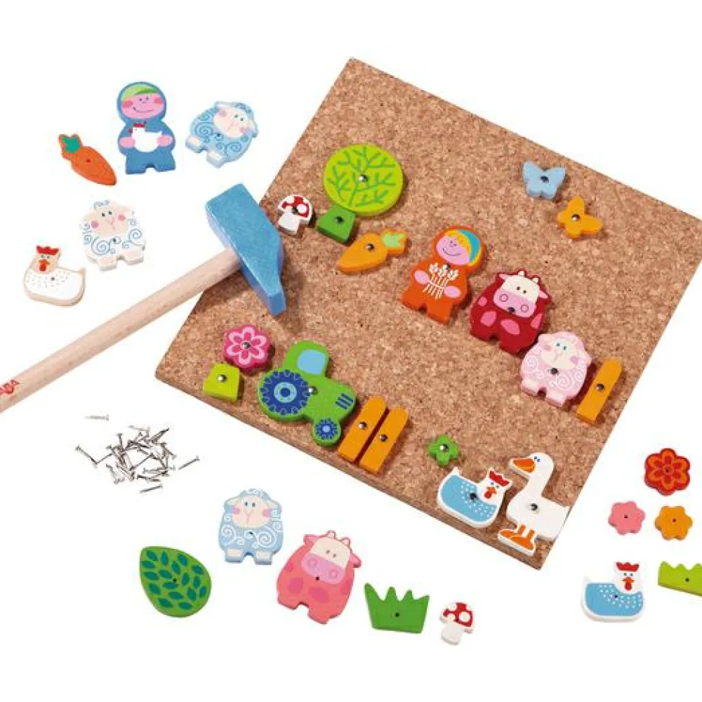 Bondegårdssættet udvikler dit barns ordforråd, når I taler om figurerne, og finmotorikken, når I banker og hamrer løs.