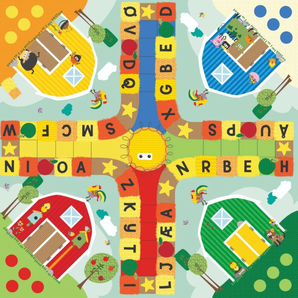 Det klassiske Ludo har fået bogstaver. Dem skal I samle og bruge til at stave ord og tælle points til at komme rundt på brættet og blive den første, der kommer i mål.