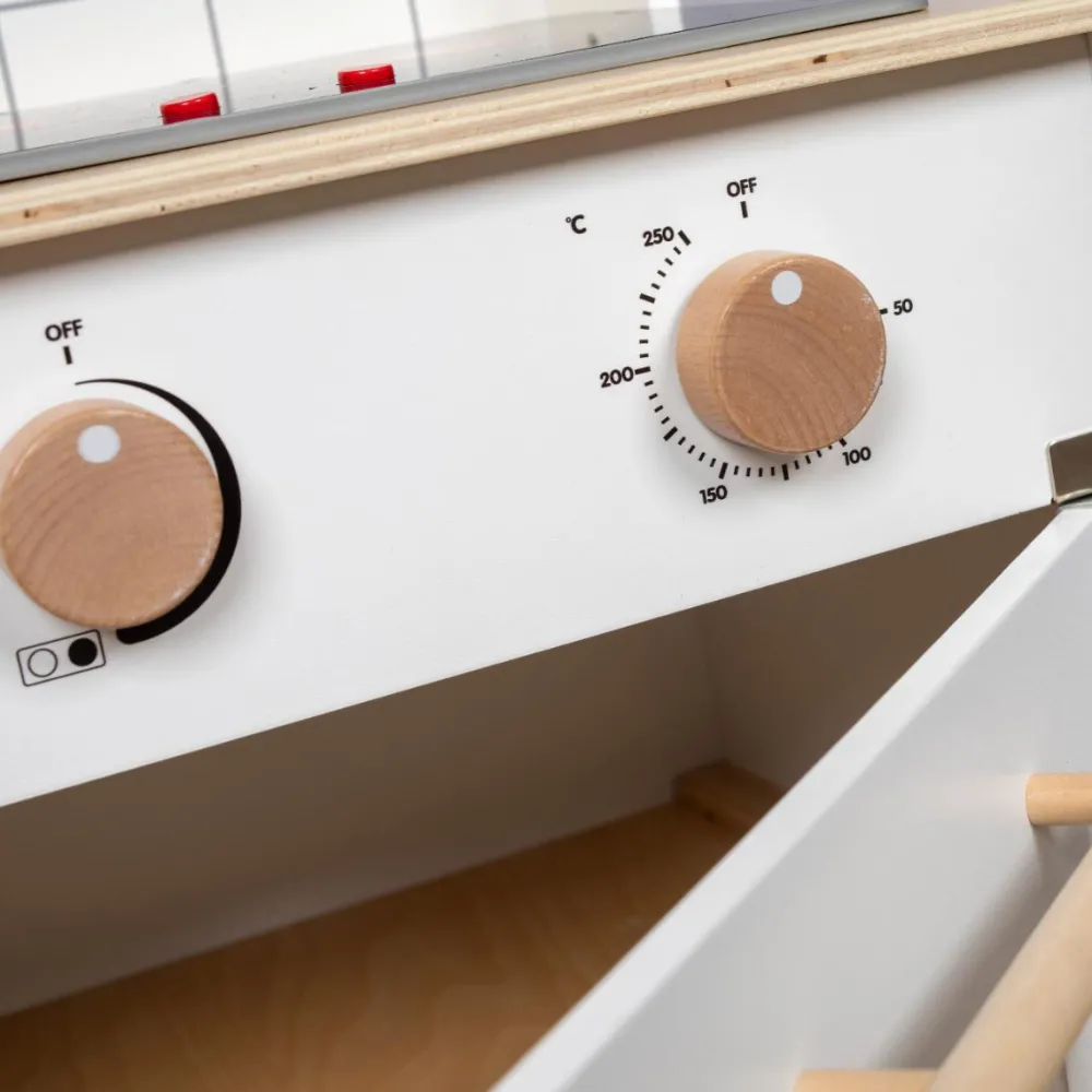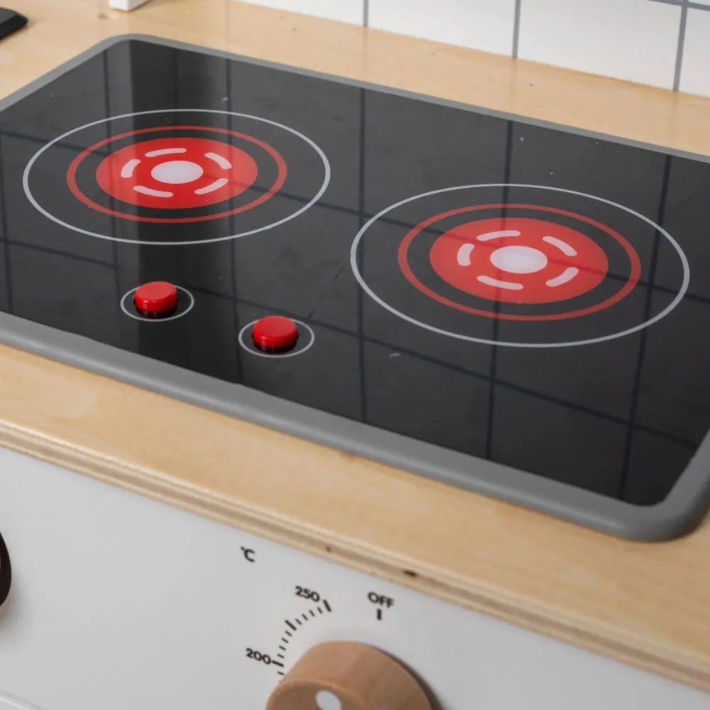Drej på knapperne og se kogepladerne lyse op med tilhørende kogelyd. Når dit barn “åbner” for vandhanen, udsender den en rislende lyd.