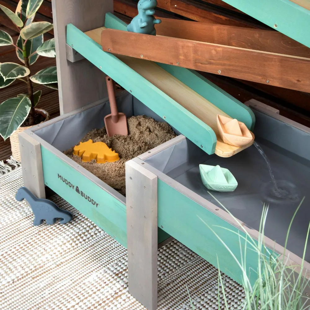 Denne skønne vandbane er super fin at lege med for en mindre gruppe børn, for den kan leges med fra alle sider. Når der hældes vand i fra toppen, løber det ned igennem banen og ender i et kar. Lige nedenunder er der endnu et kar, der eventuelt kan fyldes med sand eller bare jord, hvis det er pløre og mudder, der er et hit.