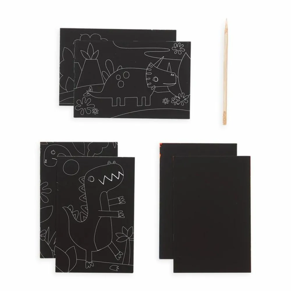 Vi har mange forskellige kort med scratch art – og selvfølgelig også nogle med dinosaurer. Og her får dit barn 6 skrabekort. De fire af kortene har motiver med seje dinosaurer, som dit barn kan få frem med træpennen. De to sidste kort har regnbuefarvet baggrund, hvor dit barn kan skrabe og selv finde på mønstre eller kreationer efter fri fantasi.