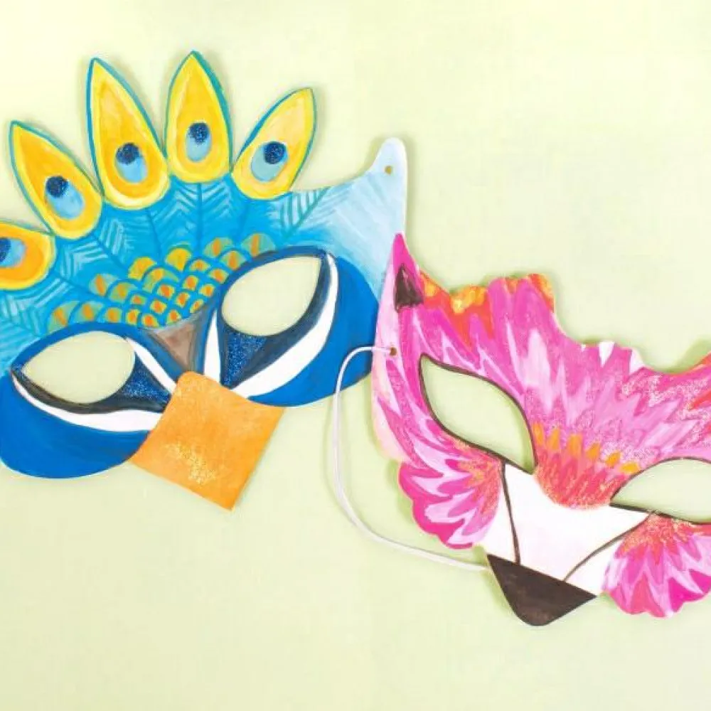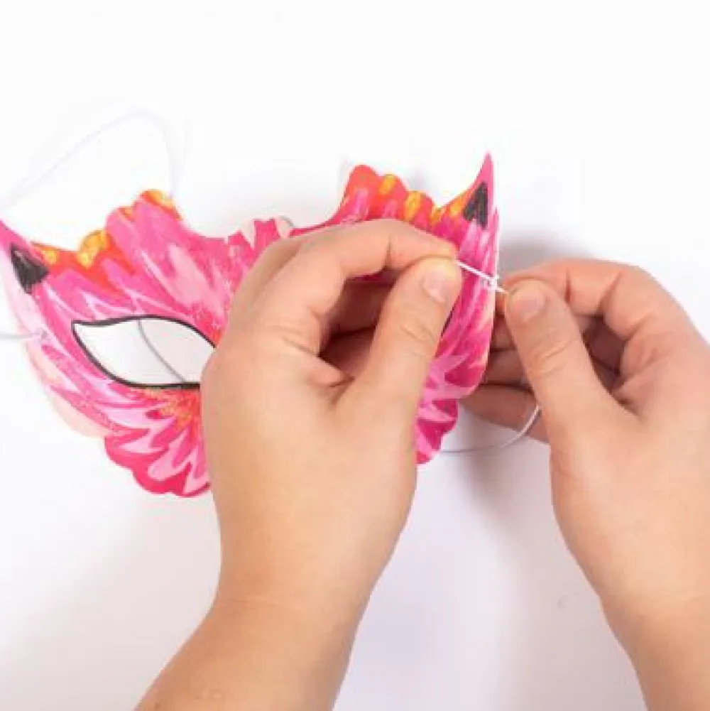 Her får dit barn bl.a. skabeloner til masker, slips, festhatte og briller, tusser, klistermærke-sten, bevægelige øjne og farvet papir.