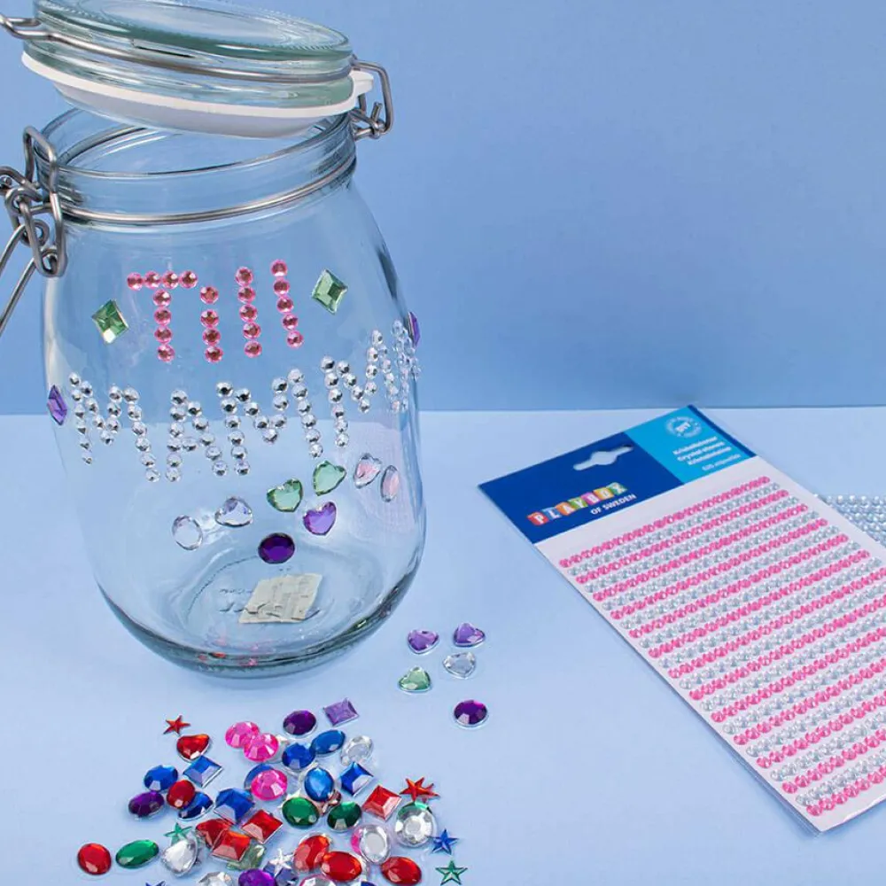 Juvelerne med klister kan sættes på skabelonerne eller pynte på glas eller andre glatte overflader.