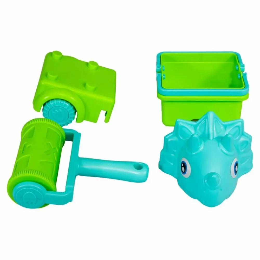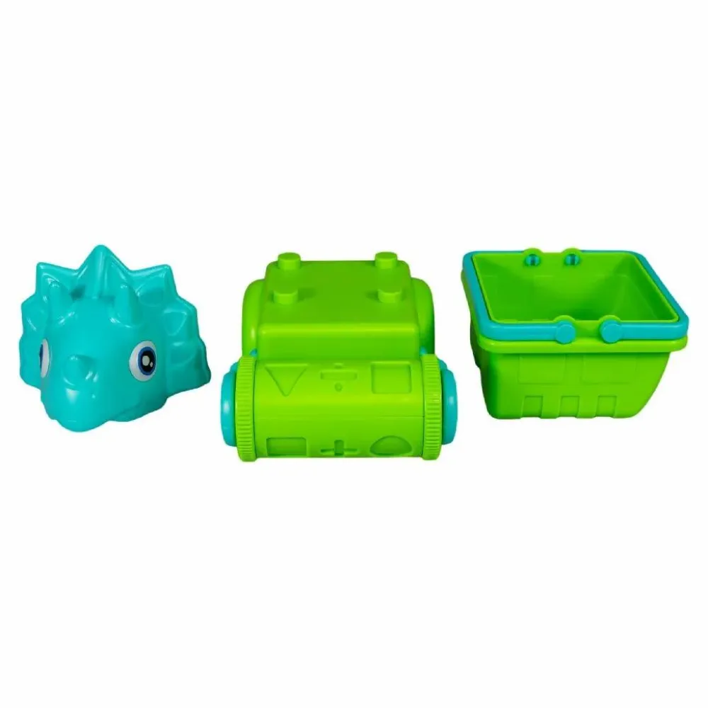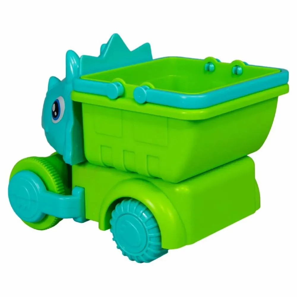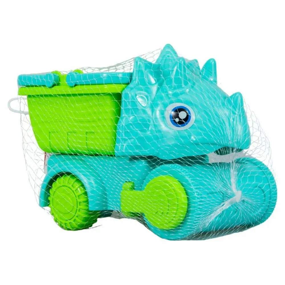 Sejt sæt, hvor skovl, en rulle til at lave mønstre i sandet og den firkantede spand kan sættes sammen og blive til en dinosaur-bil, som kan ræse rundt i sandet eller langs kanten af sandkassen. Det hele kommer i et net.