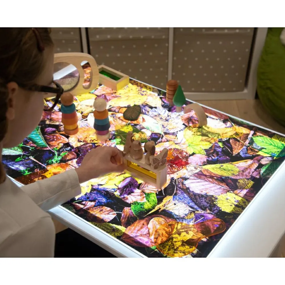Den er halvgennemsigtig, så legen bliver endnu mere eventyrlig, når den foregår på et lysbord eller anden lyskilde.