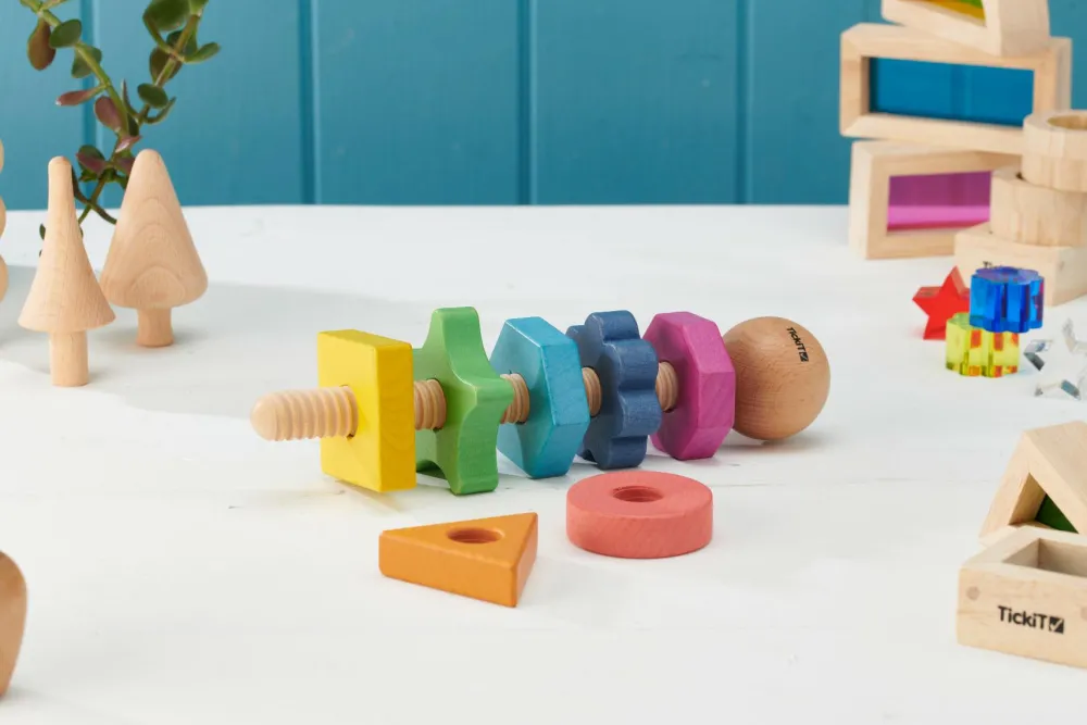 Så kan der skrues. Her er en stor bolt og hele 7 møtrikker, som dit barn kan skrue af og på igen og igen. Møtrikkerne har forskellige former og farver, og er derfor gode til at lære farvegenkendelse.