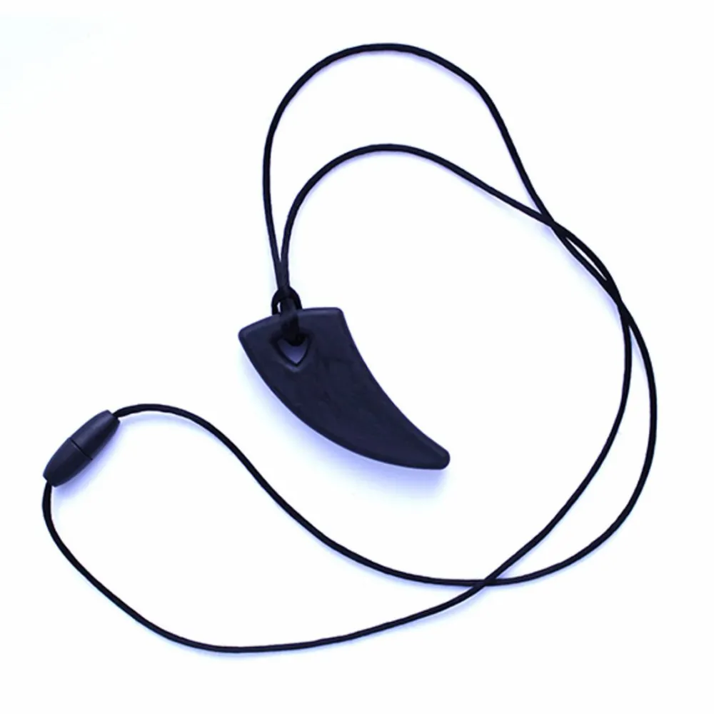 Om det er en sabel tand, en dinosaur tand eller en haj tand vil vi lade op til dig at afgøre. Denne udgave af et tyggesmykke er en for nogle lidt mere sej måde, dit barn kan stille sit behov for at tygge.
