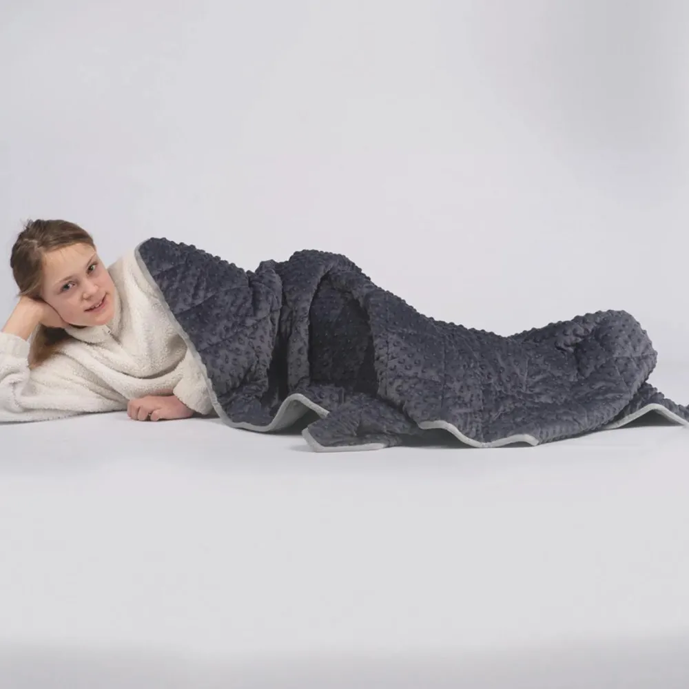 Stort vægttæppe med både glat side og taktilside, så man kan mærke, hvad der giver mest ro.