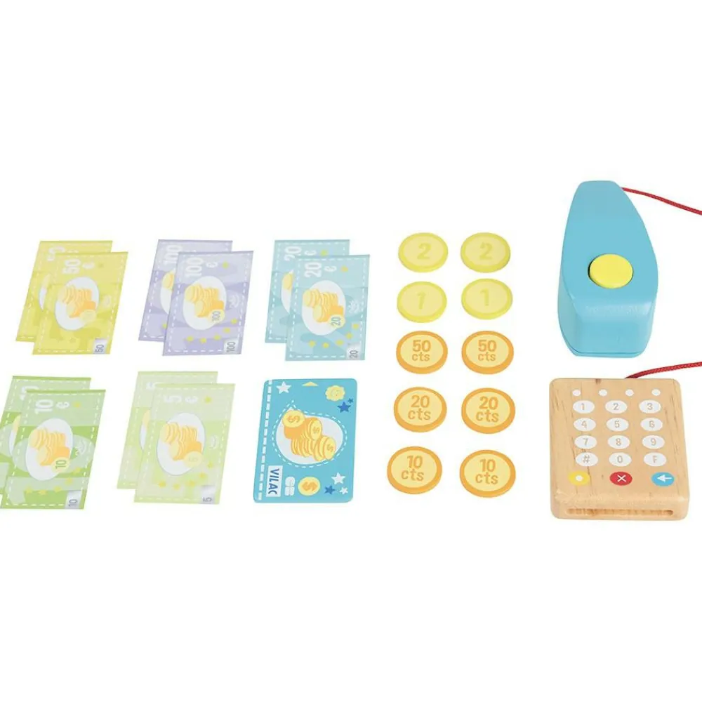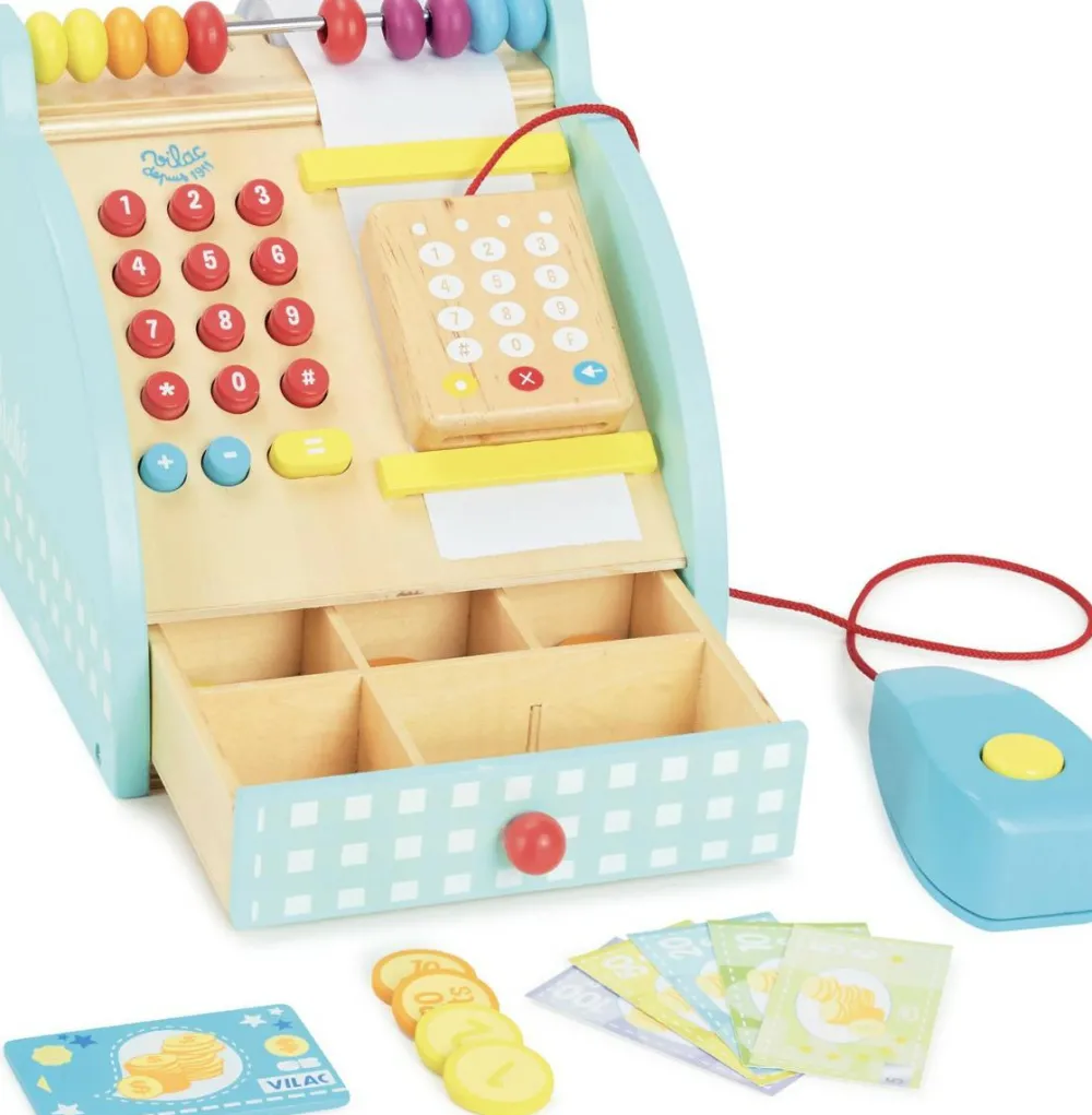 Et dejligt kasseapparat af træ i lækkert design fra franske Vilac. Moderne udformning med håndscanner, der skam bipper, når man klikker på knappen.