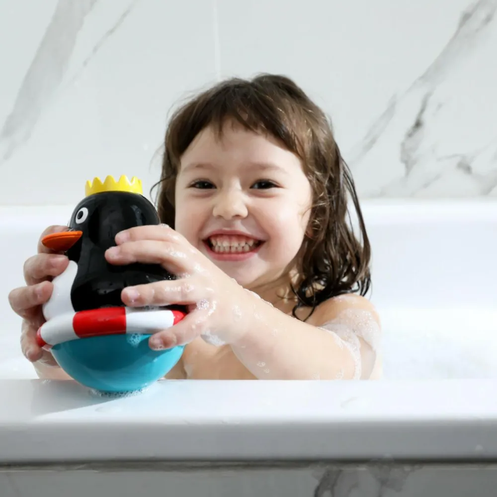I badekarret kan dit barn fylde pingvinen med vand og se, hvordan den frækt sprøjter vandet ud af næbbet igen. Det styrker dit barns muskel-ledsans, logiske tænkning og forståelse for årsag-virkning. Måske kan pingvinen sprøjte lidt på dit barns arme, ryg eller mave. Det giver en sjov og taktil sanseleg.