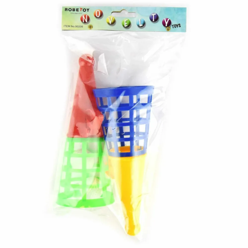 Hold i håndtagene og klik på aftrækkeren – så bliver kuglen skudt op i luften. Se om I kan skiftes til at skyde kuglen afsted og fange den med kurven.