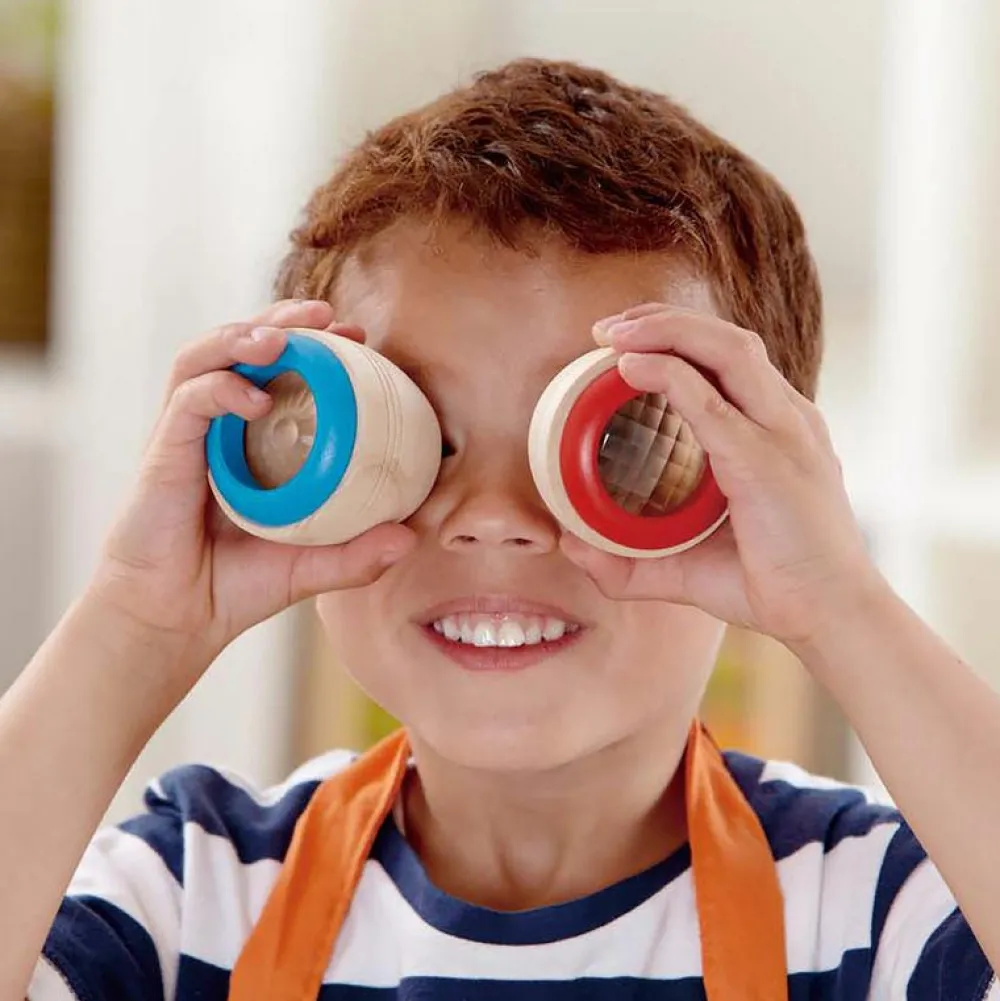 En hel ny verden åbner sig, når du kigger ind igennem de 4 små kikkerter. Det er helt kalejdoskopisk – og dit barn får en fornemmelse af, hvordan en flues syn er. Og det er endnu sjovere med en kikkert for hvert øje. Så kommer hjernen rigtig på overarbejde for at finde ud af, hvad den ser.