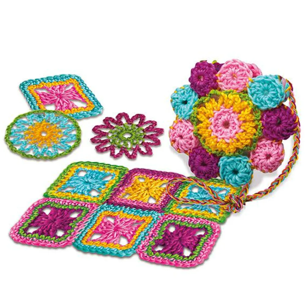 Sættet indeholder 2 hæklepinde, 1 plastiknål, garn i 7 forskellige farver og en 14 sider håndbog.