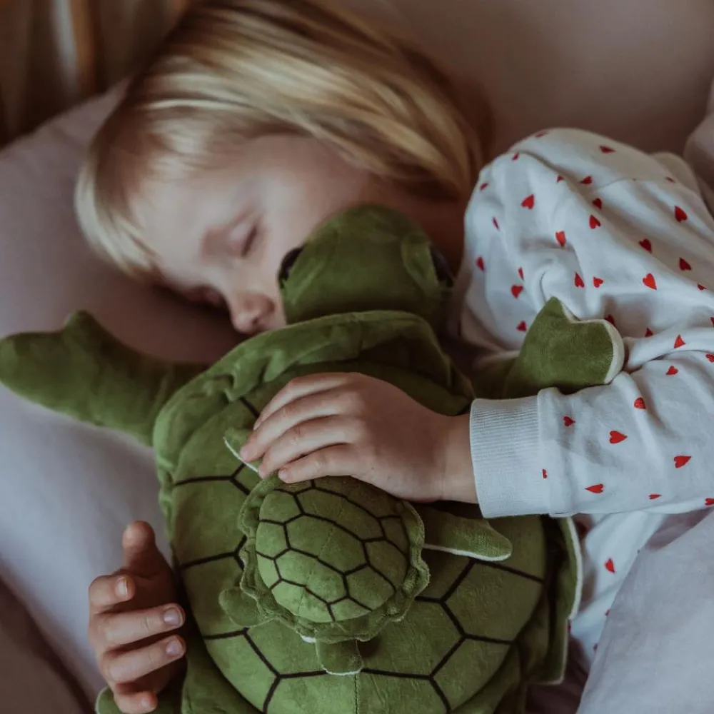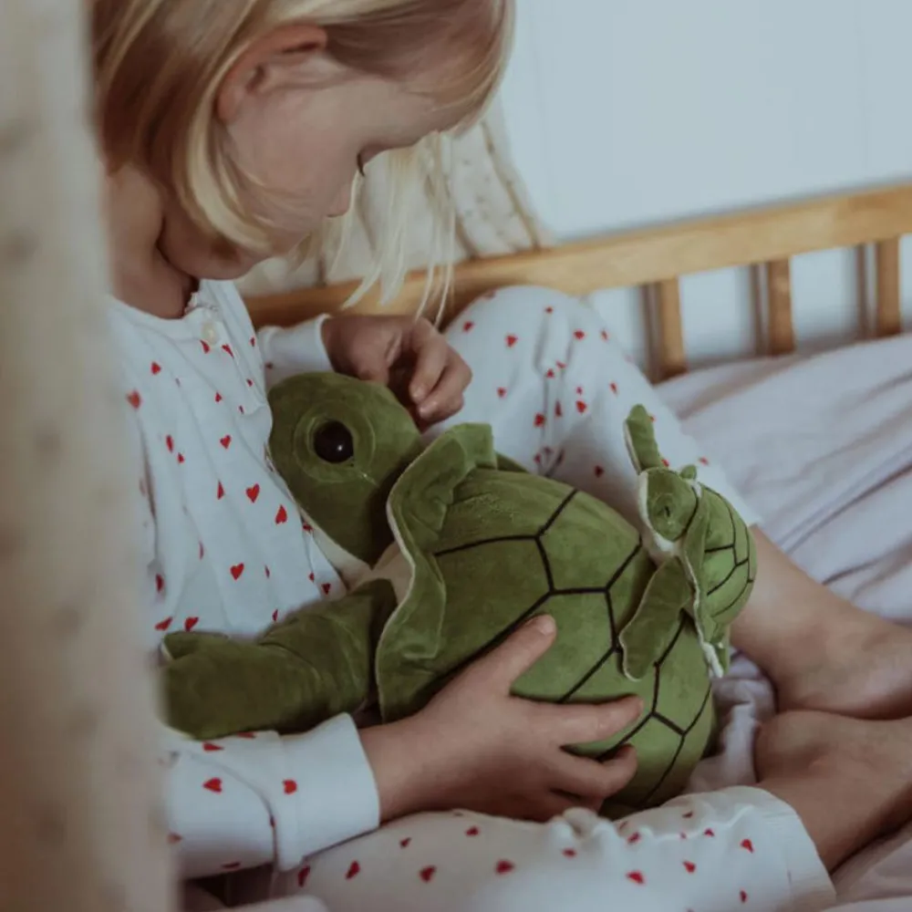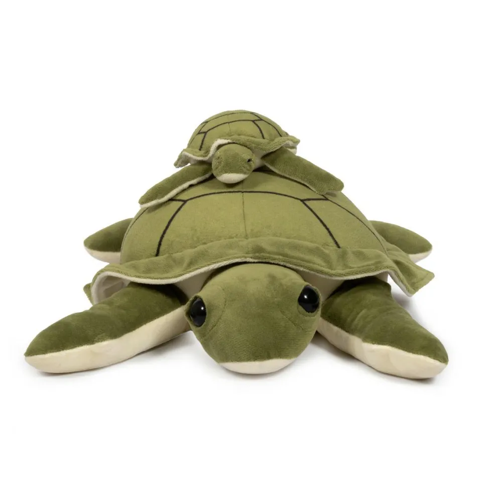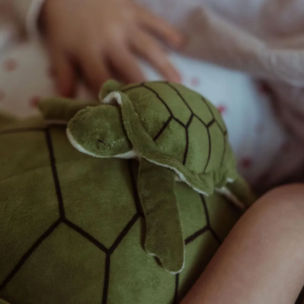 Godmodig, fredelig og beroligende skildpadde med sin unge solidt placeret på ryggen. Kan give ro og udstråle omsorg i hyggestunder i sofaen eller som sovebamse ved puttetid.