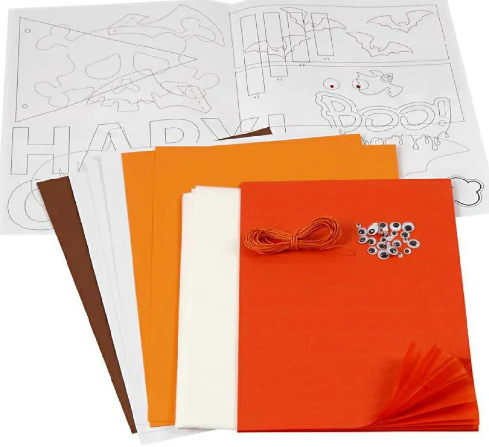 Materialesæt med karton, harmonikapapir, silkepapir, rulleøjne, snor og skabeloner til halloween dekorationer.