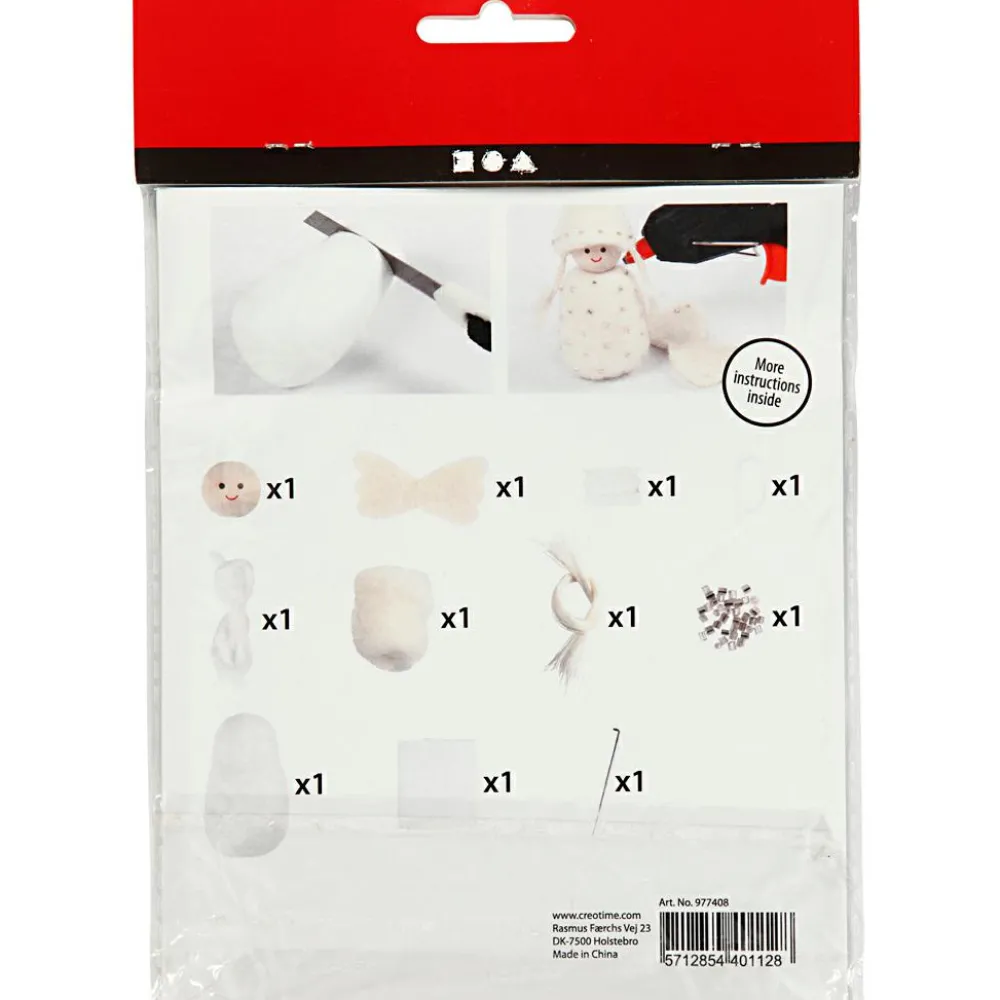 Sættet indeholder: råhvidt uld og udstanset filt, træansigt, styropor krop, rocai perler, hår, ophængssnor samt tråd og en samlevejledning.