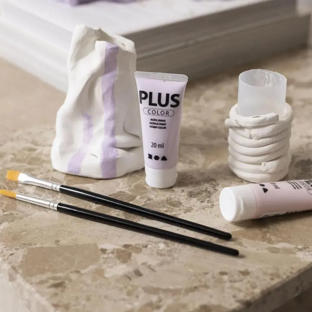 Fint sæt med selvhærdende ler, pensler, lerredskaber, maling, lysmanchet og plastikflaske.