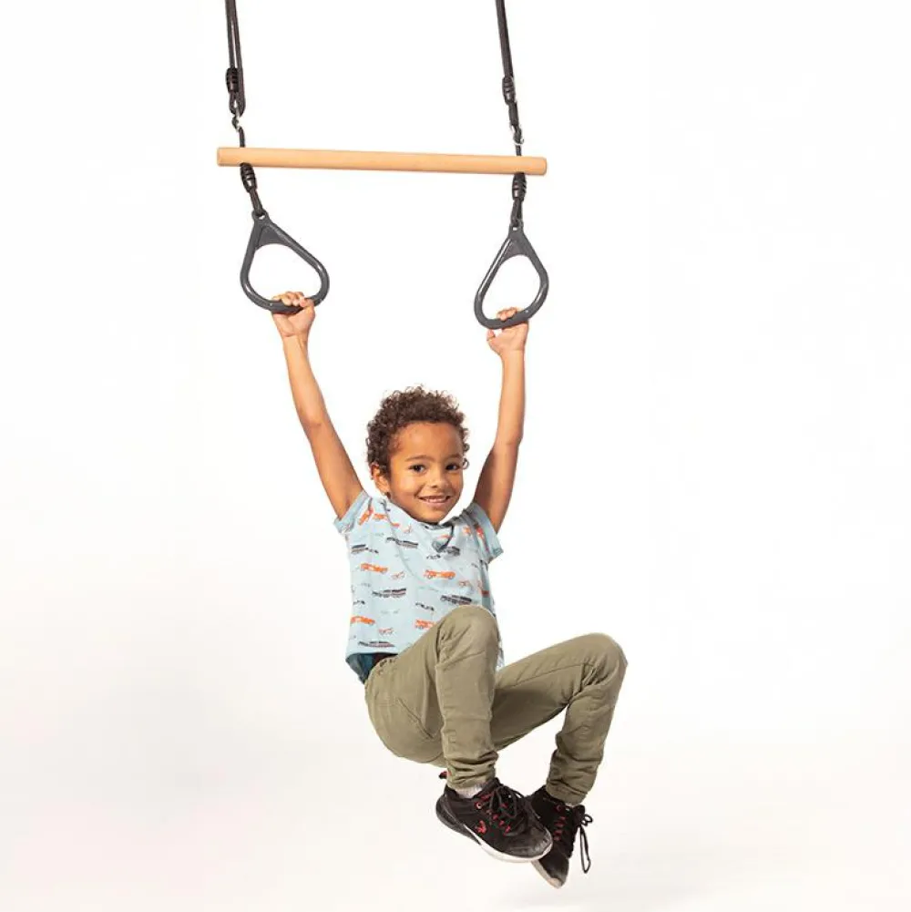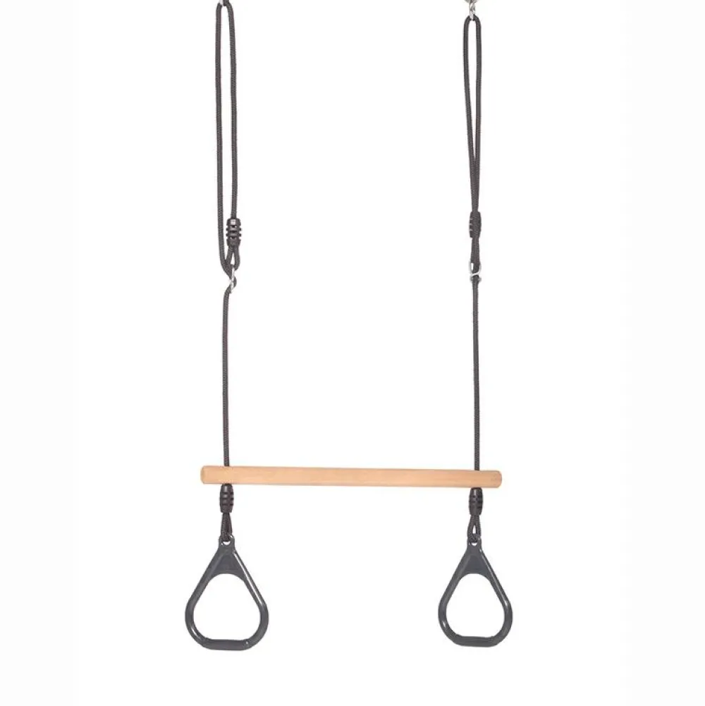 Denne trapez kombinerer en klassisk trapez af træ med plastringe, så dit barn kan svinge, hænge og lege på flere måder. Rebene kan justeres i højden, så trapezen passer til gyngestativer op til 250 cm.
