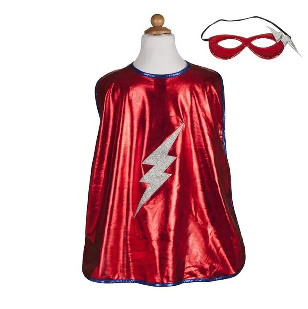 Den flotte kappe glitrer på den helt rigtige superhelte-måde, og den lukkes i halsen med velcro.