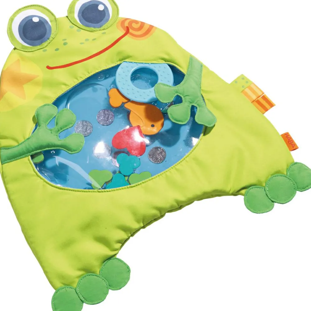 Der sidder også en dejlig bidering og bløde mærkater fast i frøen, så der er masser at undersøge og gumle på.