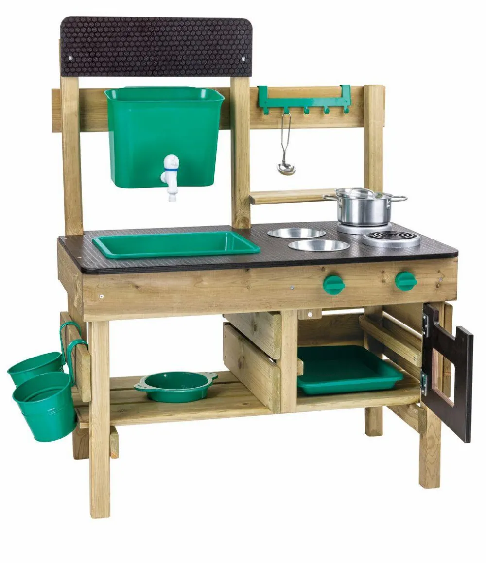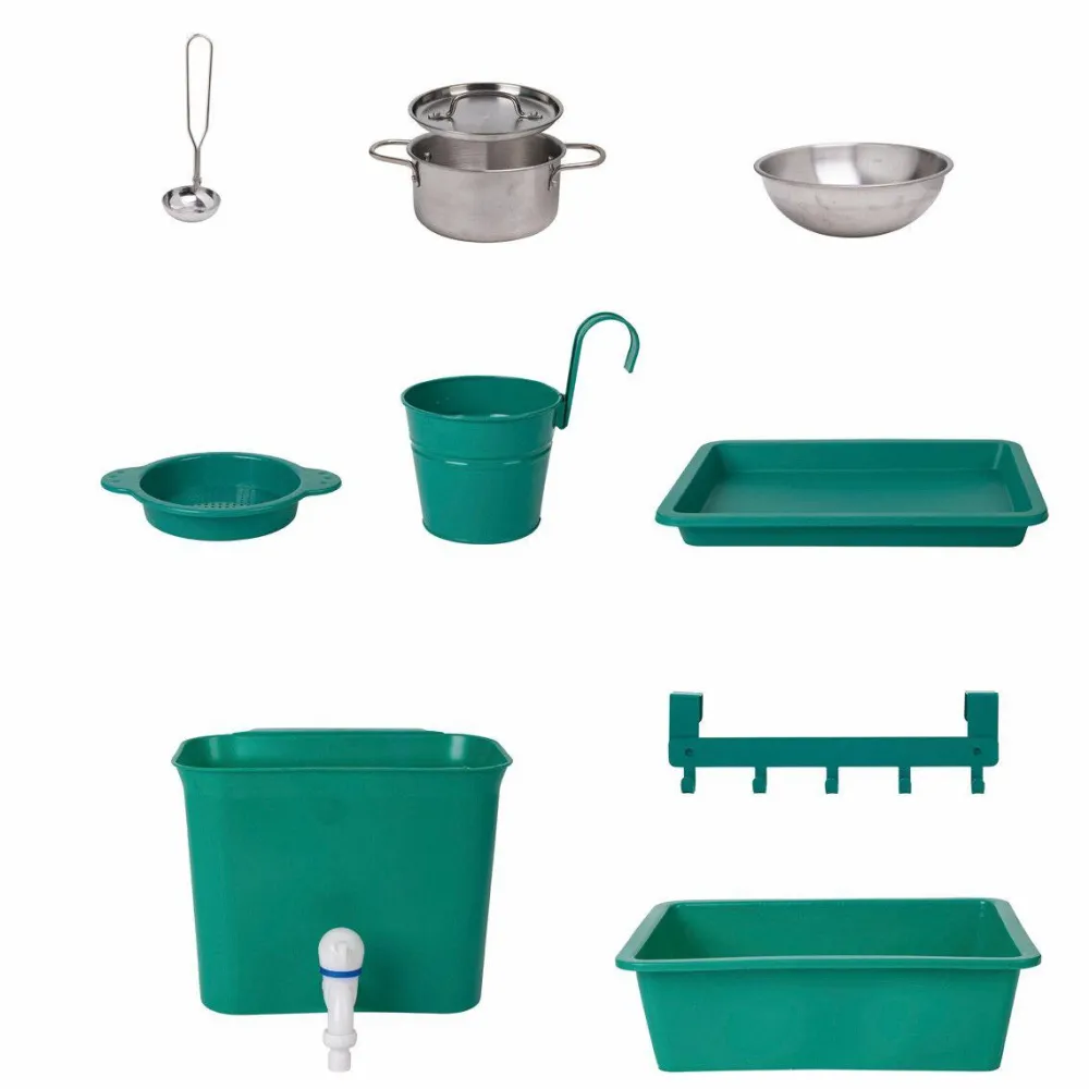 Med 30 dele til at “lave med”, plante blomster og lege med vand, som kan løbe rigtigt ud af vandhanen, når du fylder vanddunken over vasken. Klar til mudderkager, mælkebøttesuppe og bellis-postej.