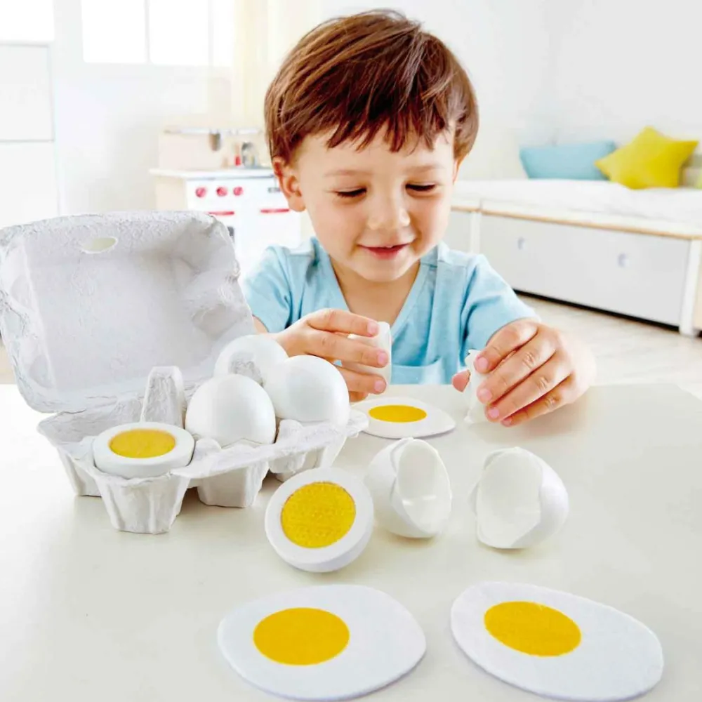 Der er 3 hårdkogte æg, som kan deles i to, og 3 spejlæg, som gemmer sig indeni æggeskallerne.