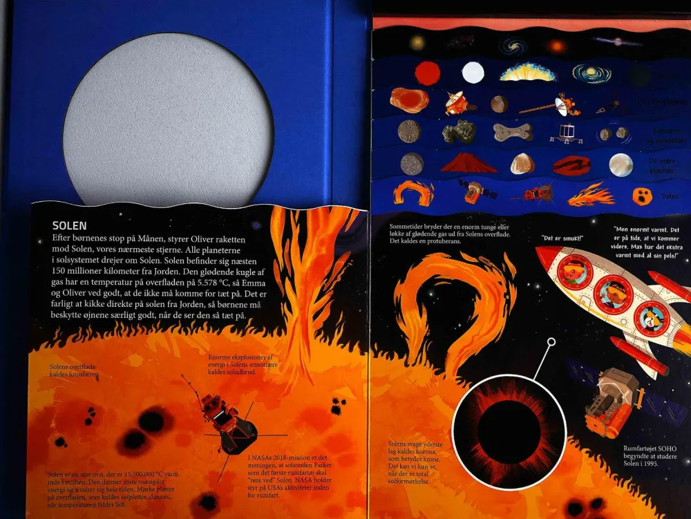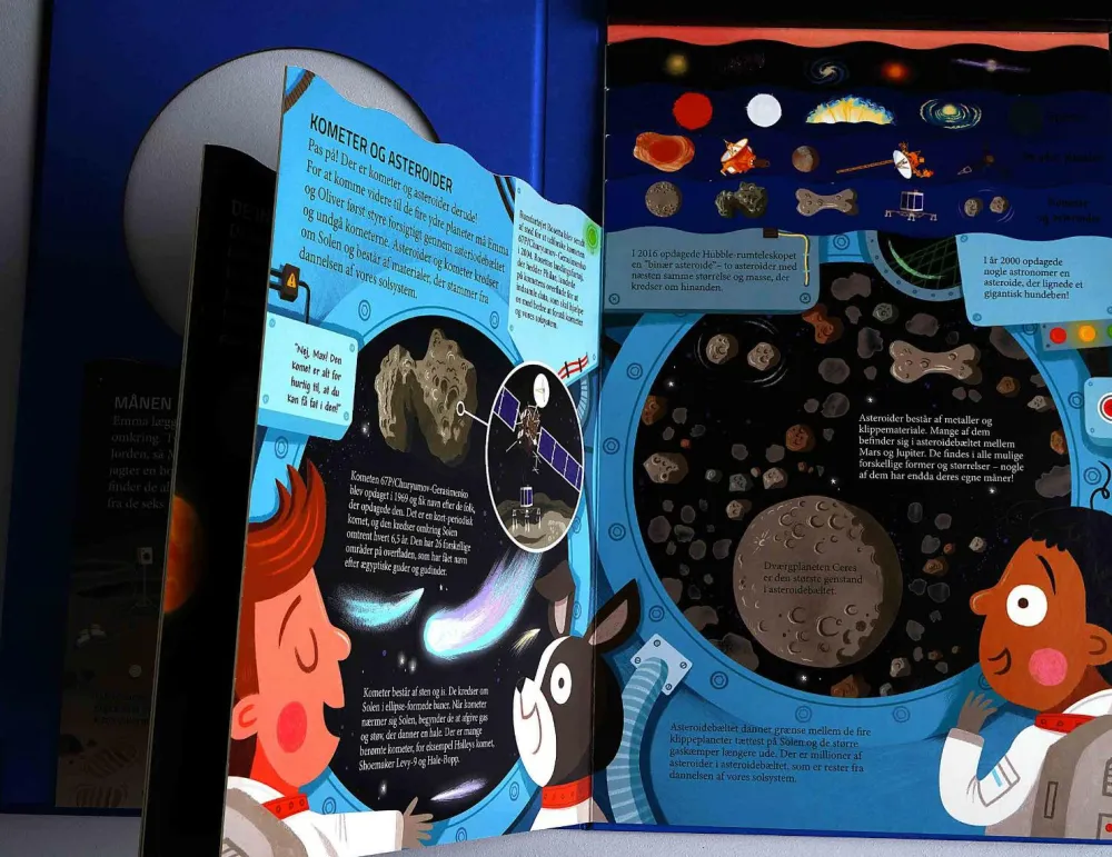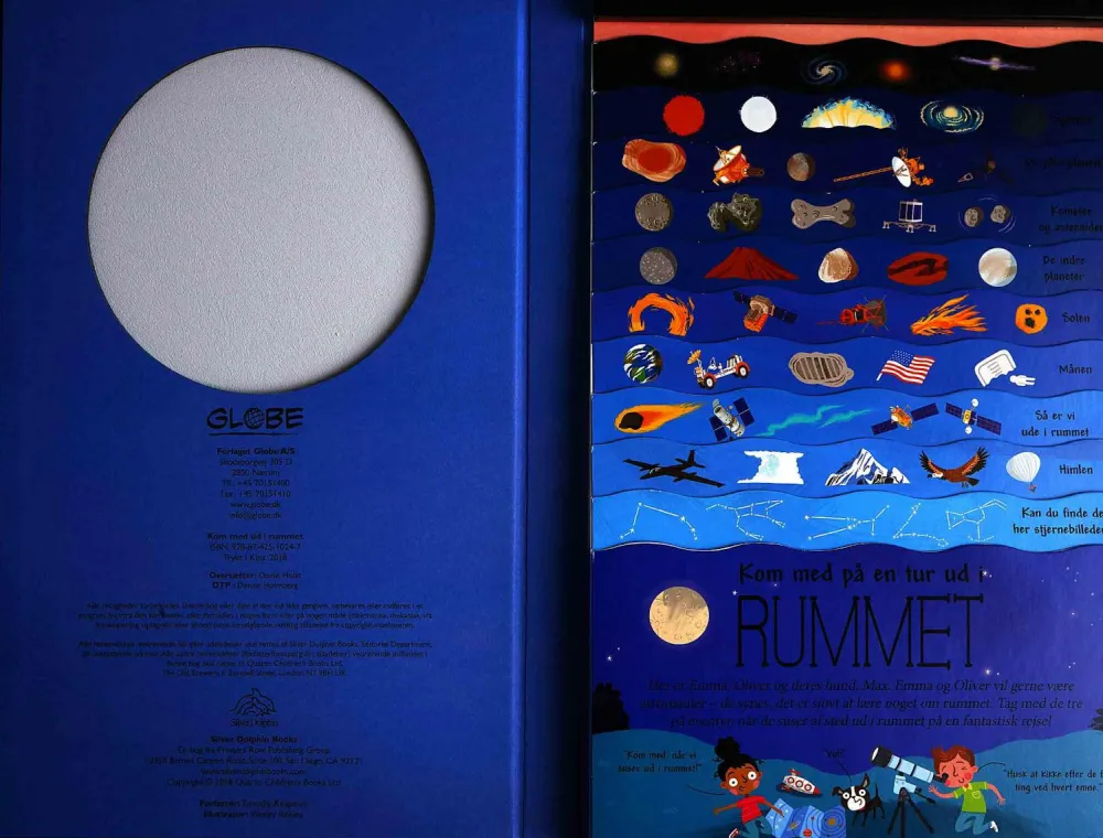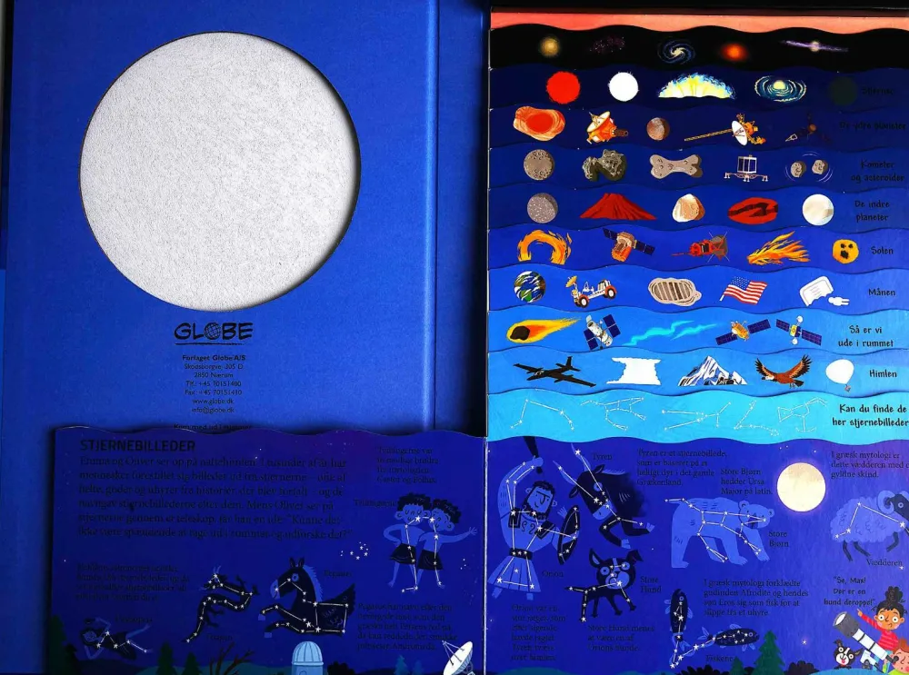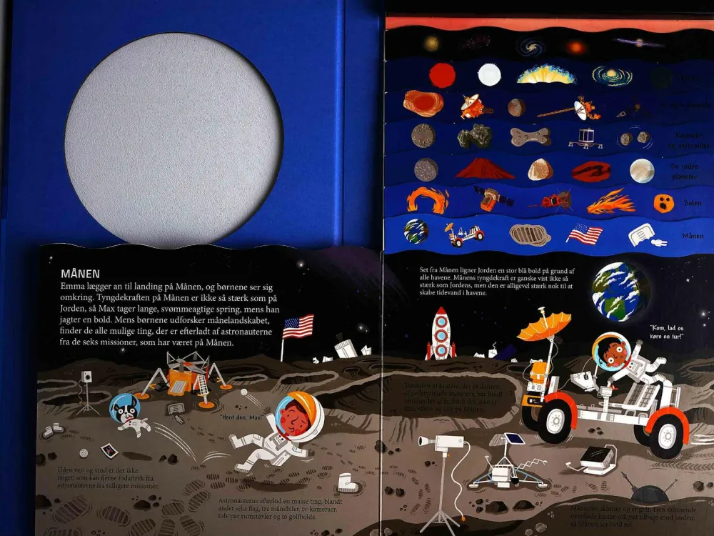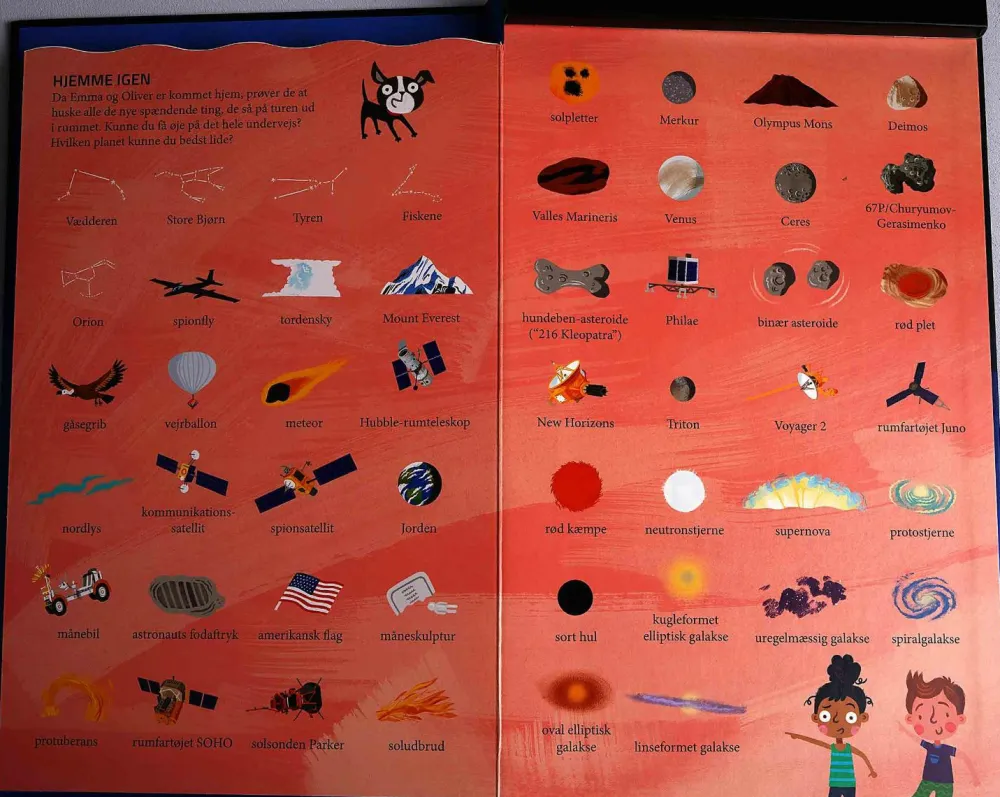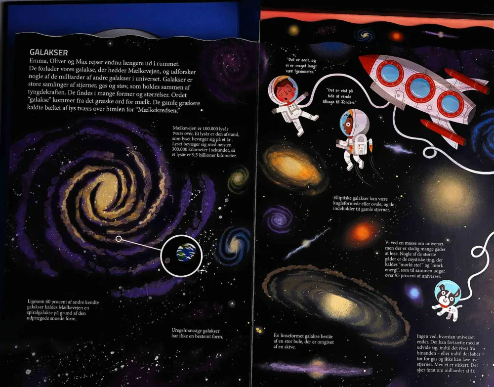 En herlig bog for små rumnørder, hvor I på 22 sider kan komme hele vejen rundt om vores fantastiske galakse med kig-og-find opgaver.