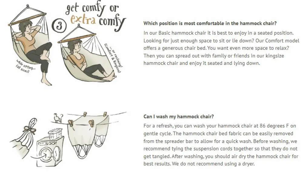 Hængekøjestolen er vejrbestandig og tåler 30 graders skånevask i vaskemaskinen.