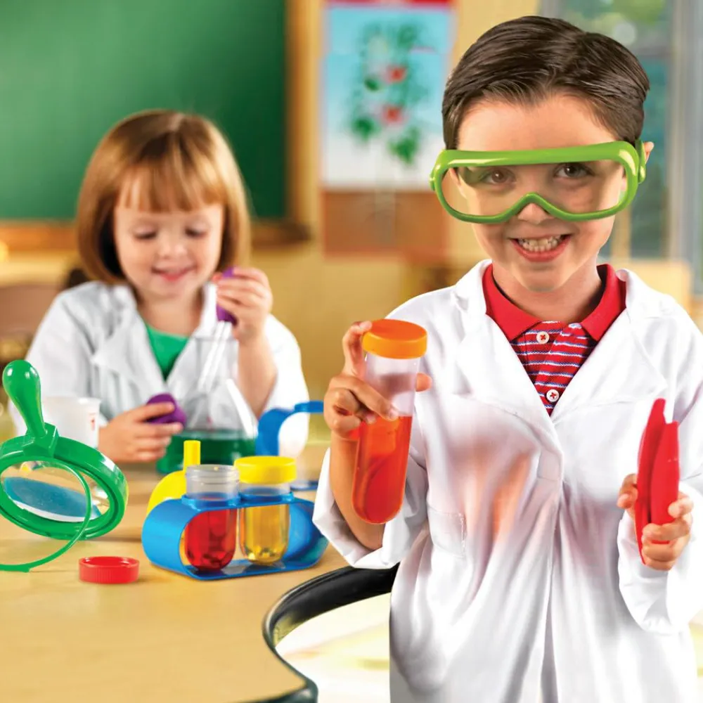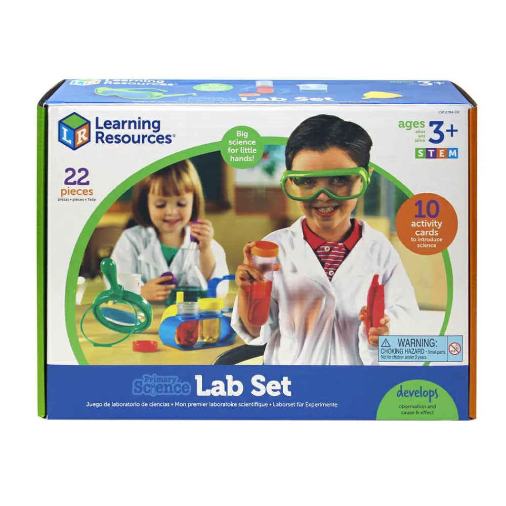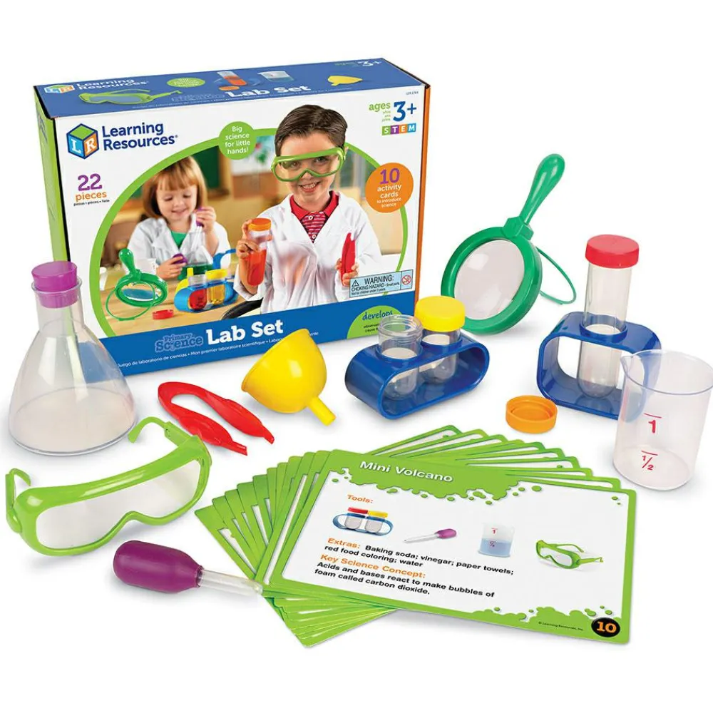 Sættet indeholder bægre, forstørrelsesglas, tragt, pipette, kolbe, pincetter, beskyttelsesbriller, store og små reagensglas med låg og stande og 10 aktivitetskort. Aktivitetskortene er på engelsk men med fine illustrationer. Kortene er til at tørre af, hvis man skulle komme til at spilde på dem.