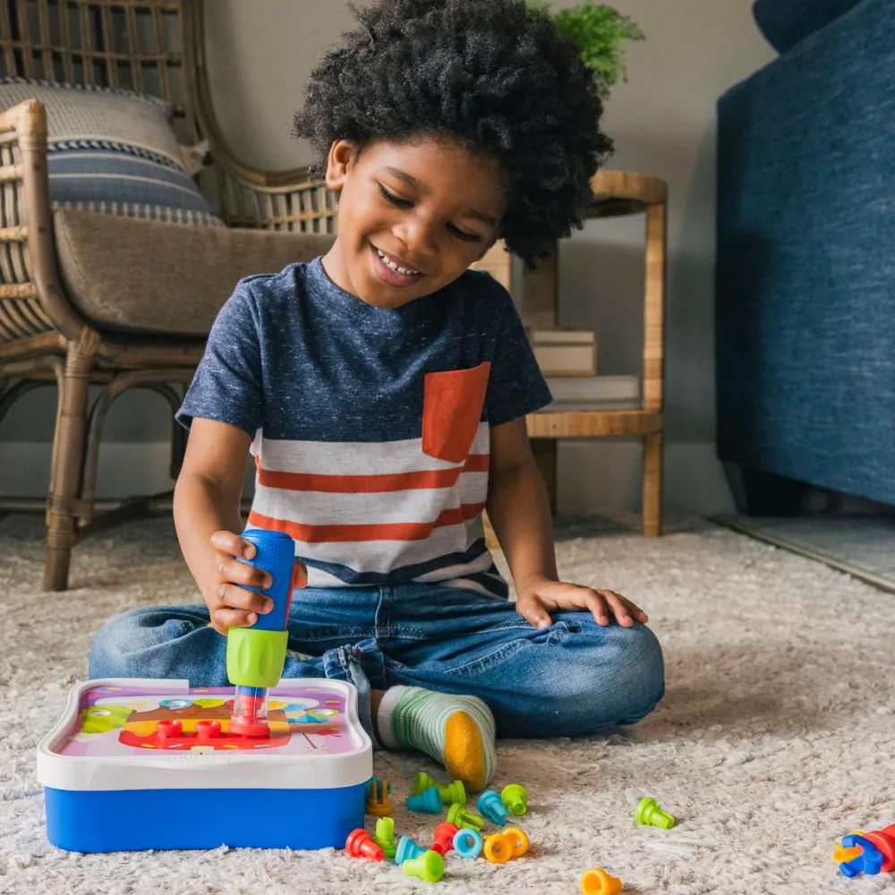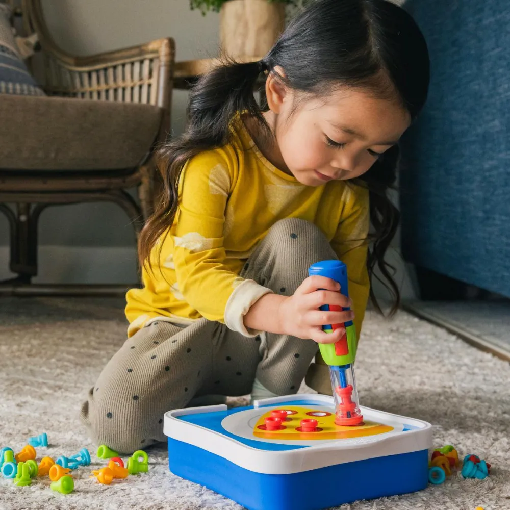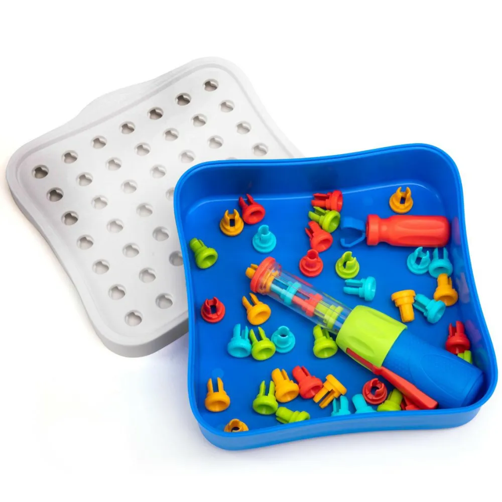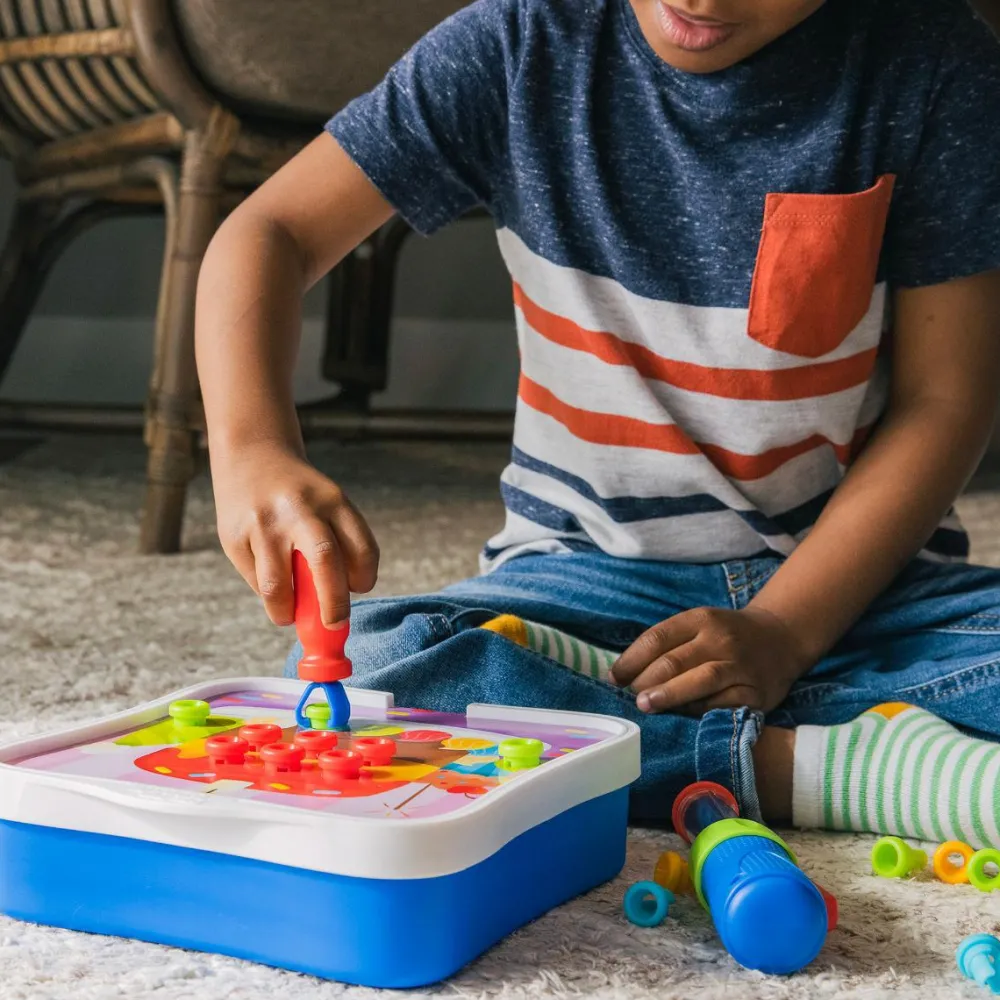 Savner du at have fjernbetjening, hårspænder, køleskabsmagneter og nøgler for dig selv? Så er skrue-dimse-pille-legetøj som dette en herlig gave til dit barn. Legen kan få dit barn til at føle sig dygtig til at dimse. Og det kan give dit barn et større mod på at kaste sig ud i nye udfordringer.