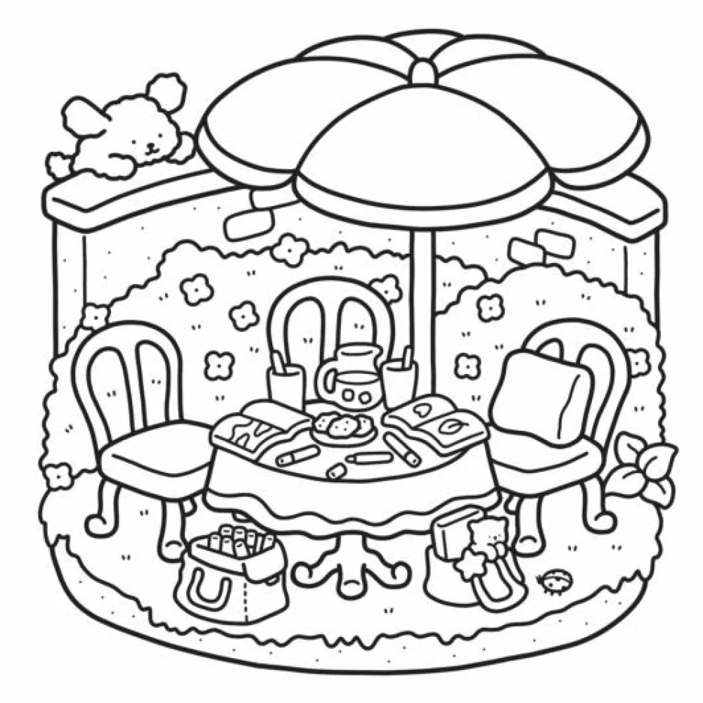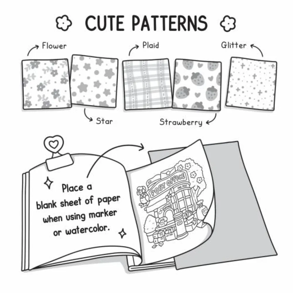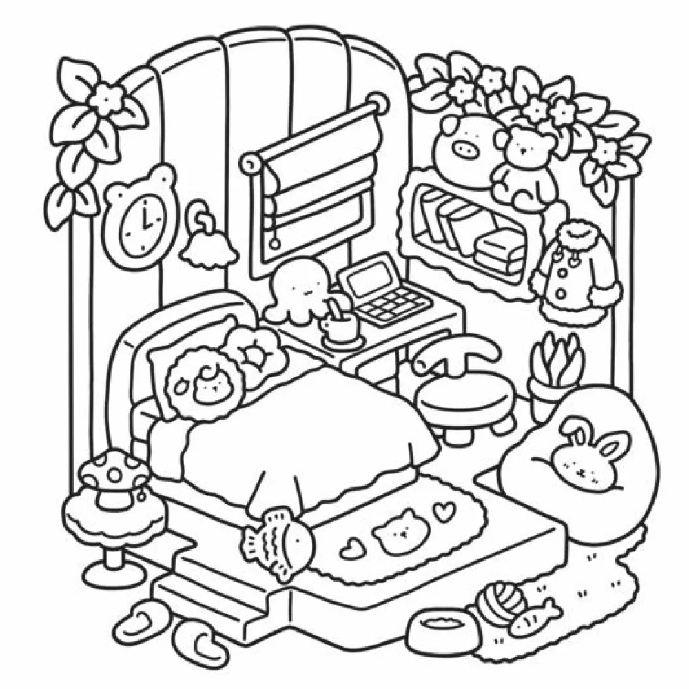 Alle de søde motiver er tegnet tydeligt op med ret brede streger, men til gengæld er der ikke ret mange små detaljer på siderne. Hvis et gardin skal være stribet eller en blomst have mange farver, så er der rig mulighed for, at man selv opfinder mønstre og dekorationer.
