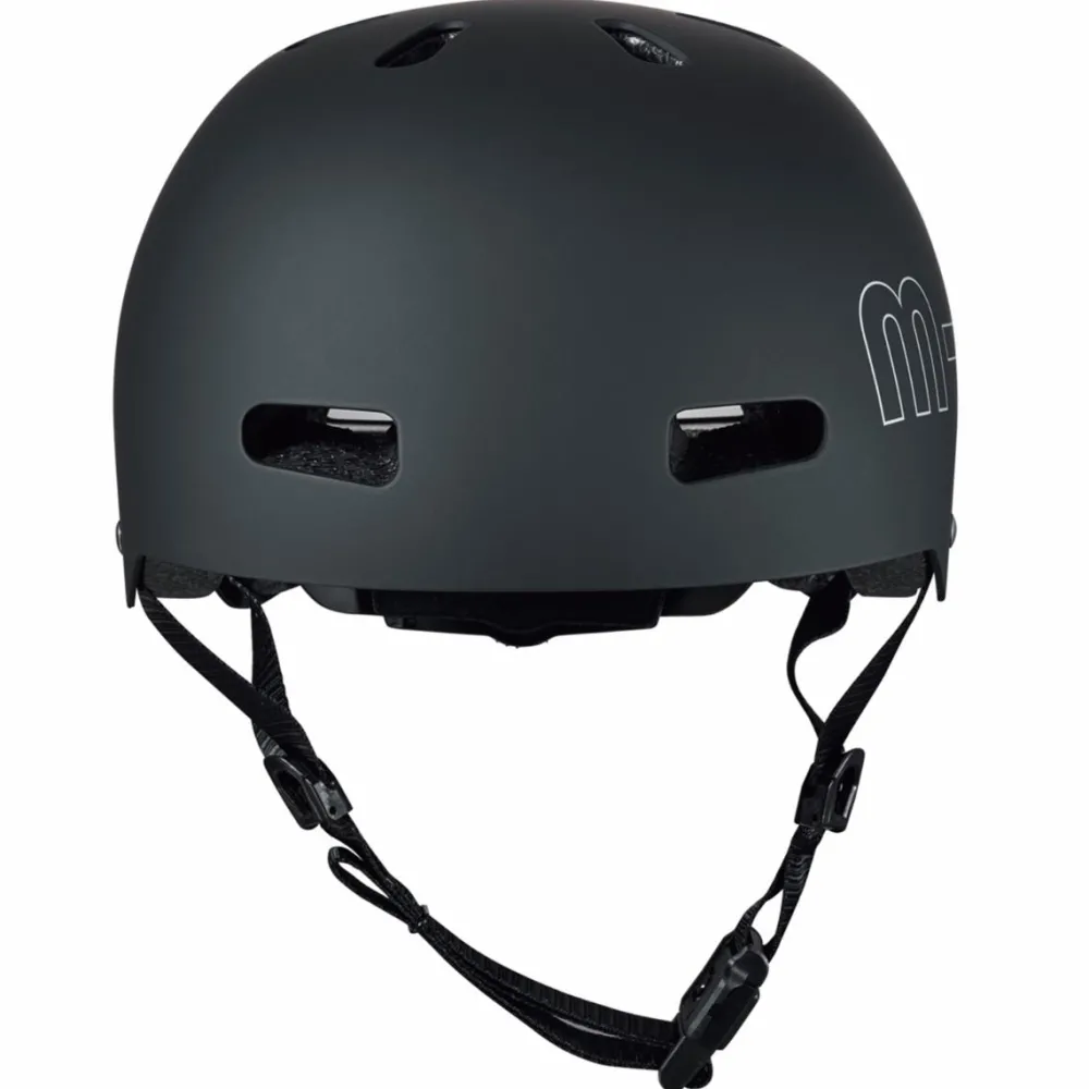 Sort cykelhjelm fra Micro, som kan justeres til i størrelsen ved at dreje på knappen bagpå. Med behagelig polstring (der kan tages ud og vaskes) og magnetlukning under hagen.