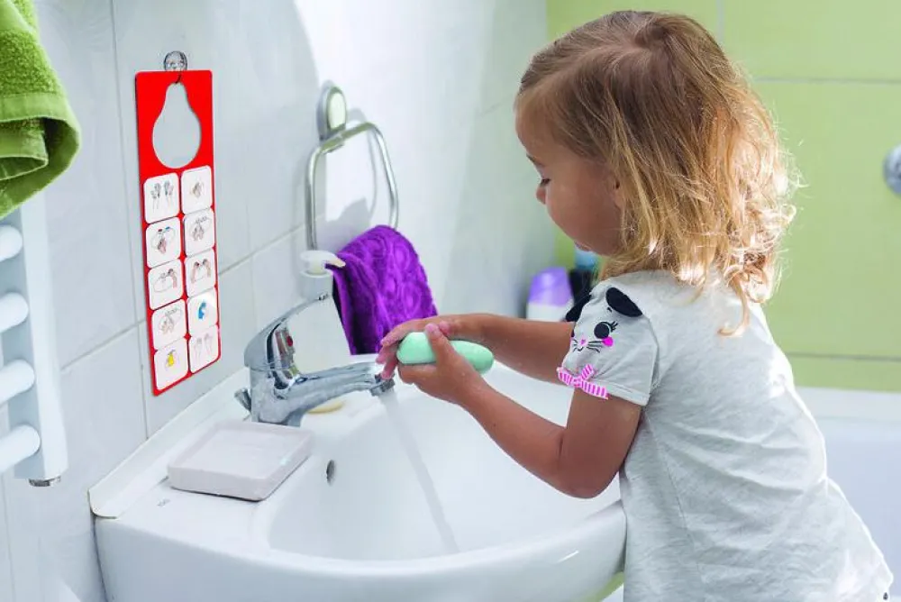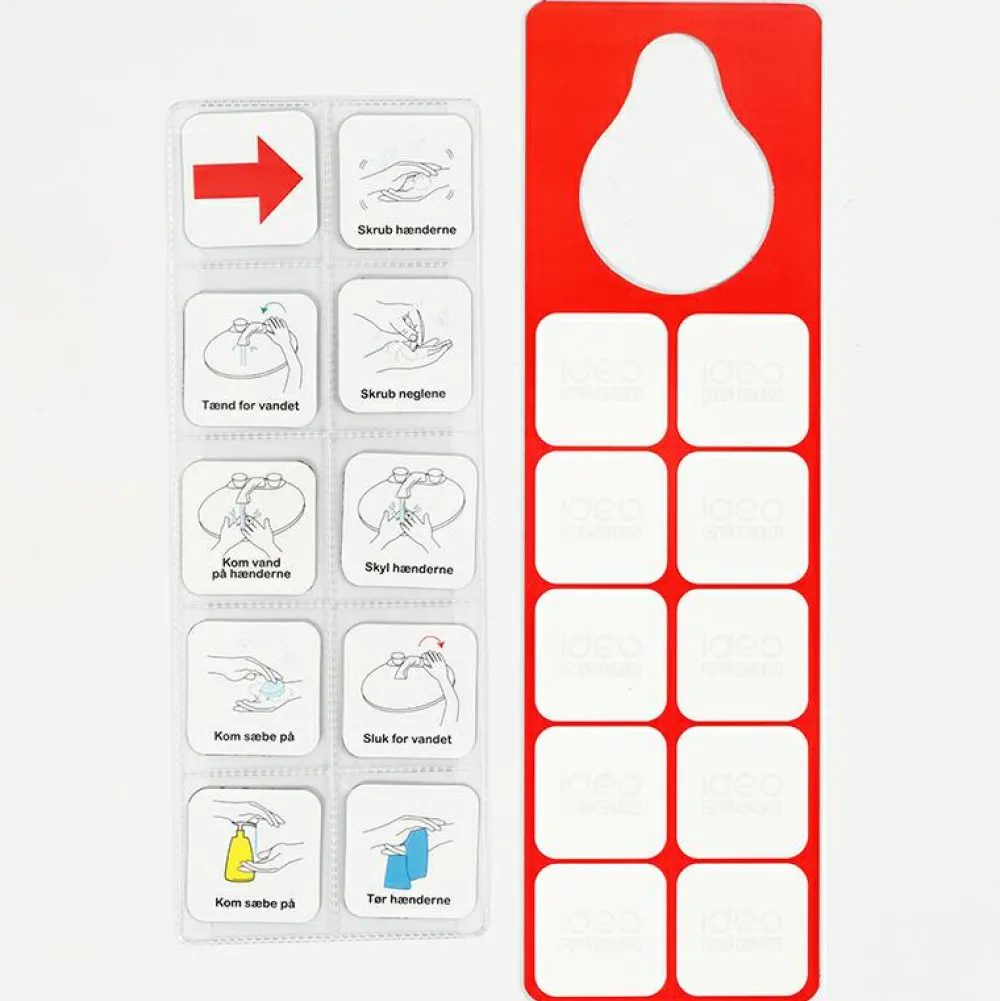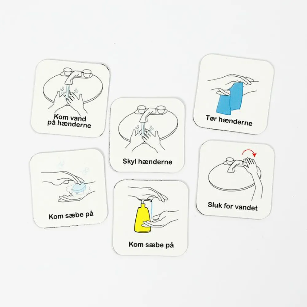 Meget praktisk piktogramserie til at lære hele familien at vaske hænder, så de bliver helt rene. Her er 10 letforståelige piktogrammer med dansk tekst, der viser alle 10 trin i at få hænderne rene.