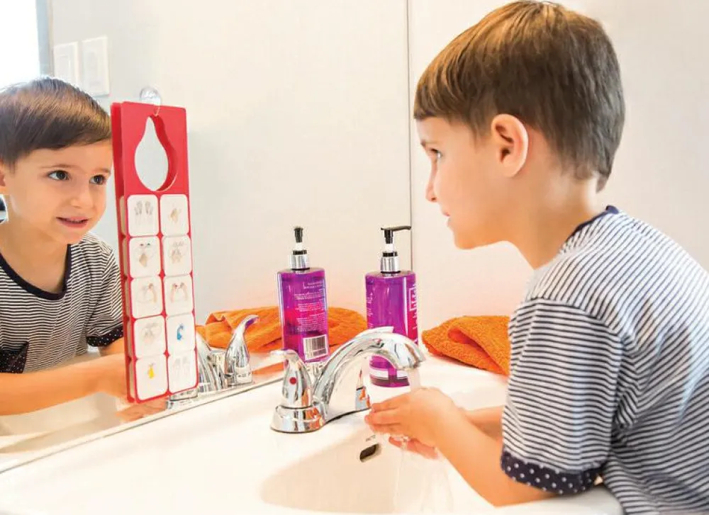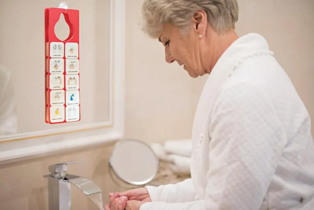 Med piktogrammerne kan hænges på en krog eller et håndtag eller sættes fast på spejl eller fliser ved hjælp af den medfølgende sugekop.