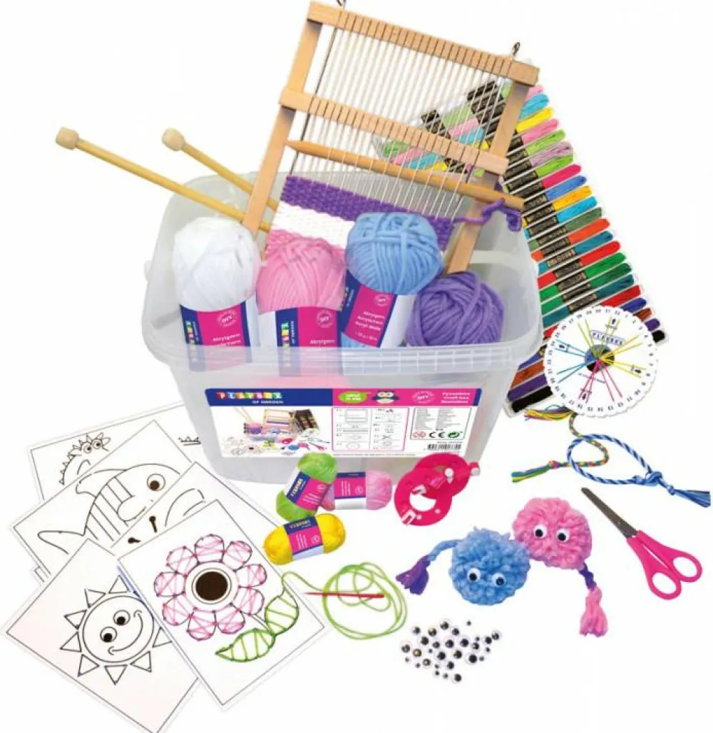 Så er sættet her med fokus på håndarbejde lige sagen. Kassen er nemlig fyldt med garn, væveramme, pompon-værktøj – og plastøjne, hvis der lige blev designet en sjov figur i forbifarten.