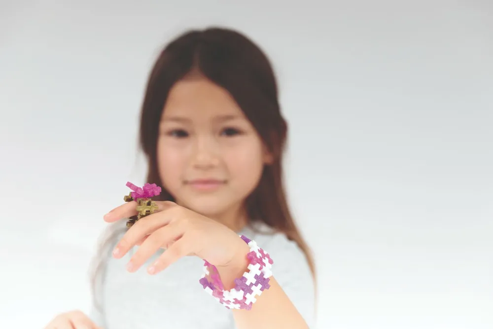 220 af de alsidige Plus-Plus brikker eller klodser og en byggevejledning, der hjælper dit barn i gang med at lave fine, glitrende smykker af dem og samtidig styrke sin fantasi og kreativitet.