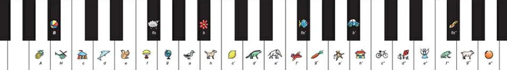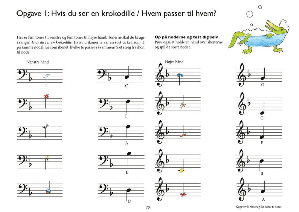 I disse bøger, udviklet af musiklærer Pernille Holm Kofod, er der en planche med klaverets tangenter, hvor hver tangent har en figur, der starter med det samme bogstav som tangentens musikalske navn.