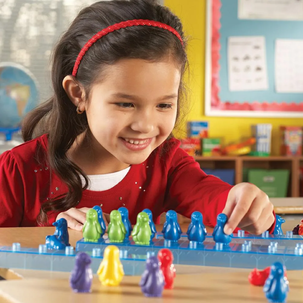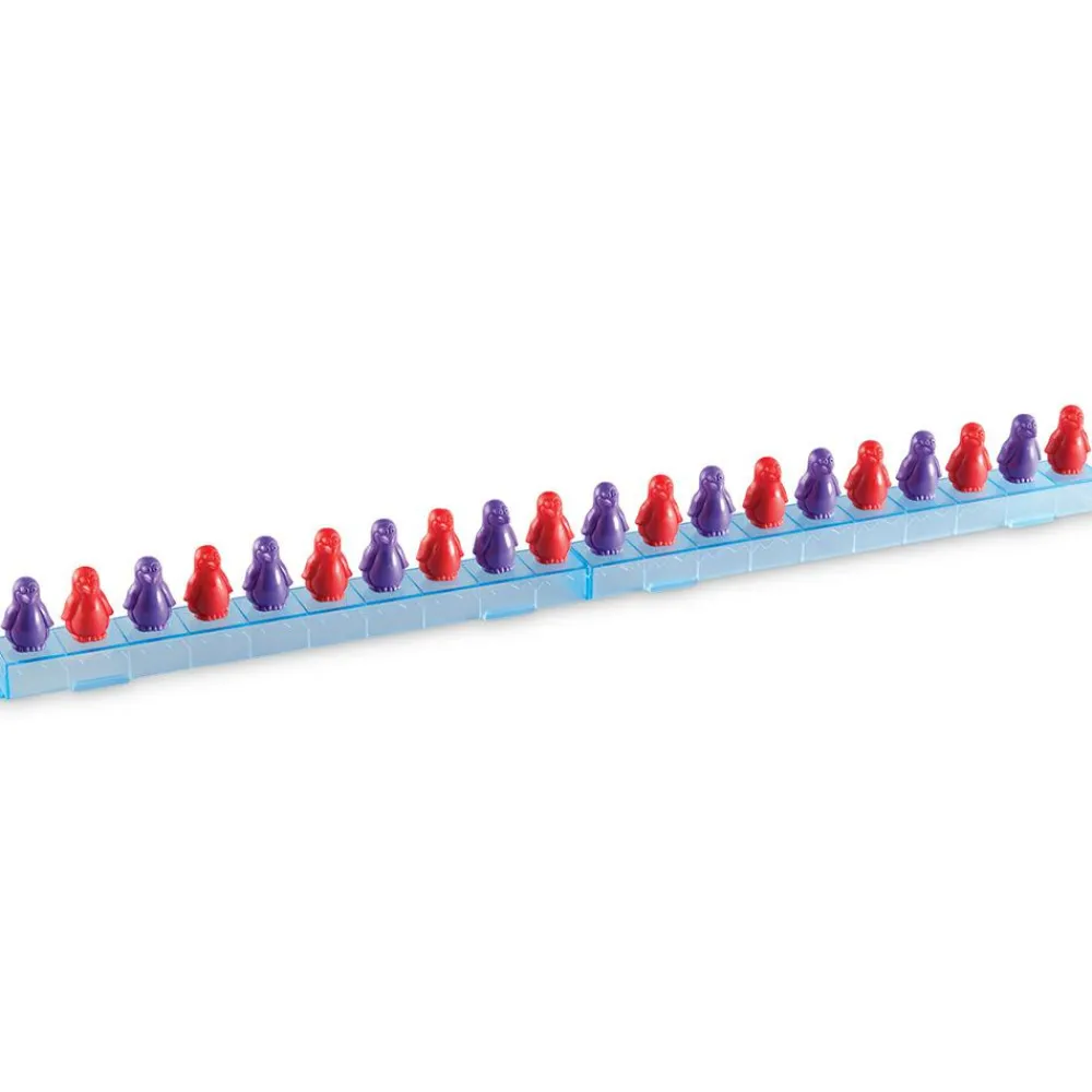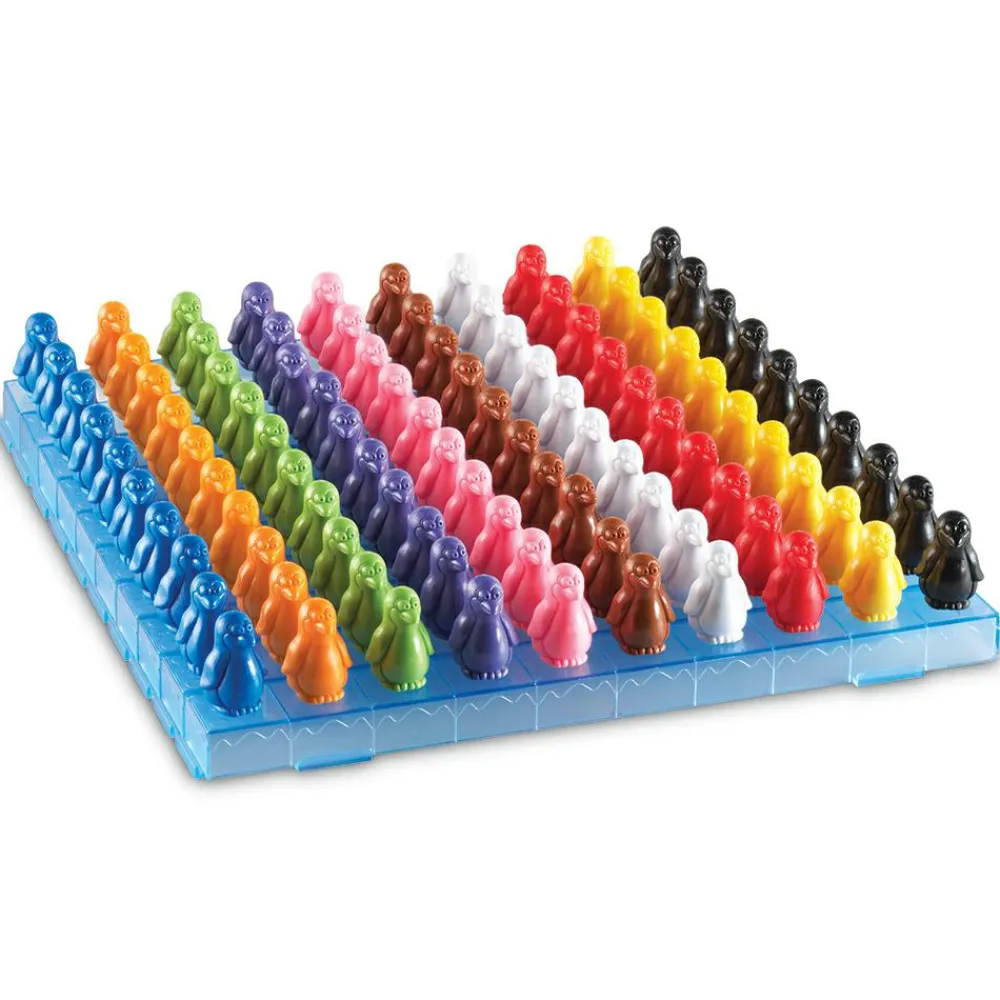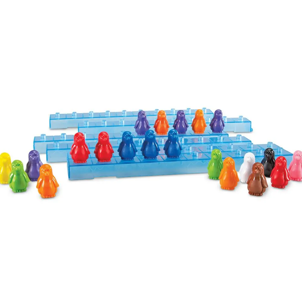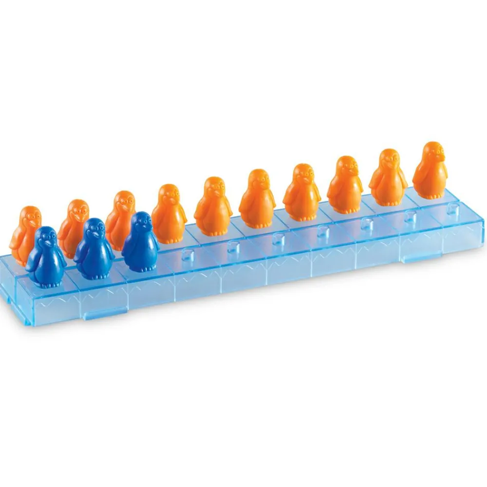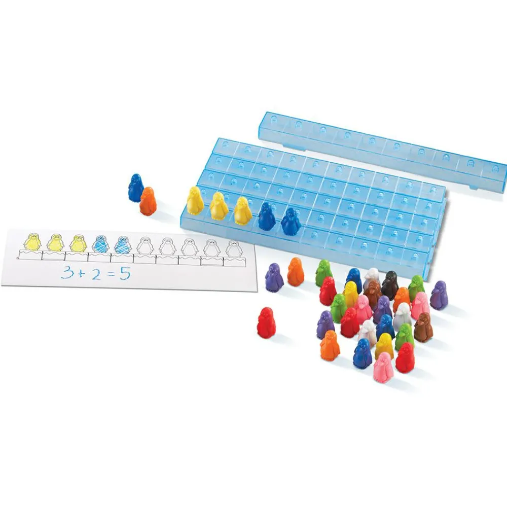 Med dette sæt kan I lege med pingviner og øve børns evne til at tælle, dele i 10 (finde 10’er venner), lave mønstre, øve farvernes navne, sortere og lave små regnestykker.