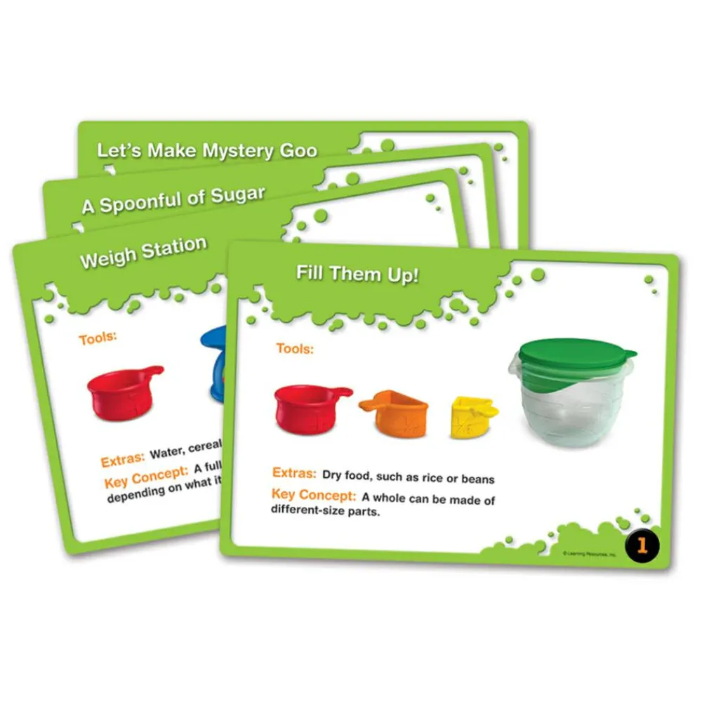Med sættet følger 10 flotte aktivitetskort (på engelsk men med fine illustrationer) med opskrifter på ting som barnet kan lave sammen med en voksen. De fleste børn vil synes det er sjovt, at lave deres egen modellervoks eller ulækker slim. Ingredienserne til opskrifterne er ikke med i sættet men er ting, vi ofte har stående i køkkenskabene.