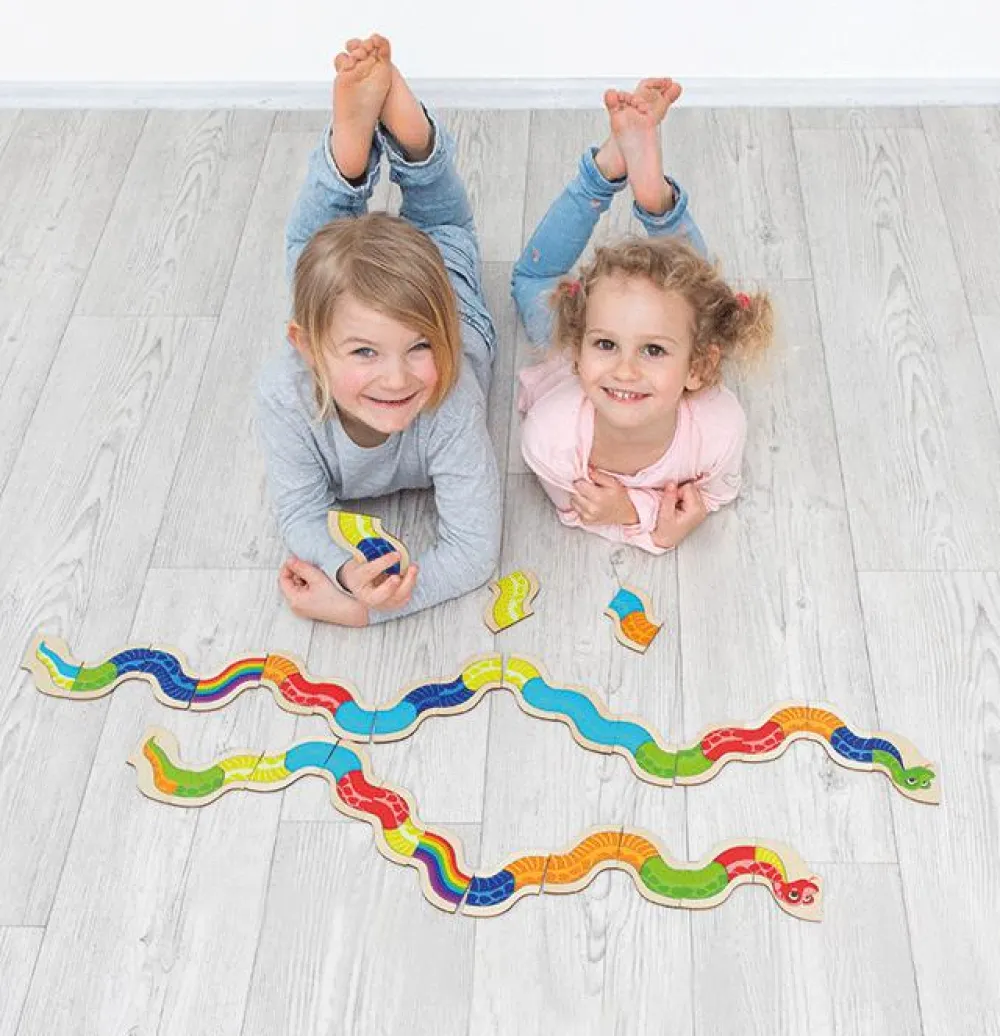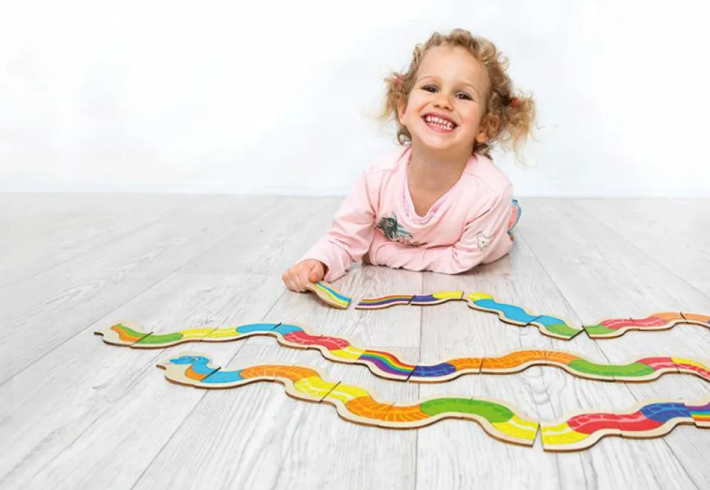 Dit barn øver sig i at genkende farverne i dette spil domino, for det skal der til for at matche farverne og komme af med alle sine slangebrikker og dermed stå som vinderen.