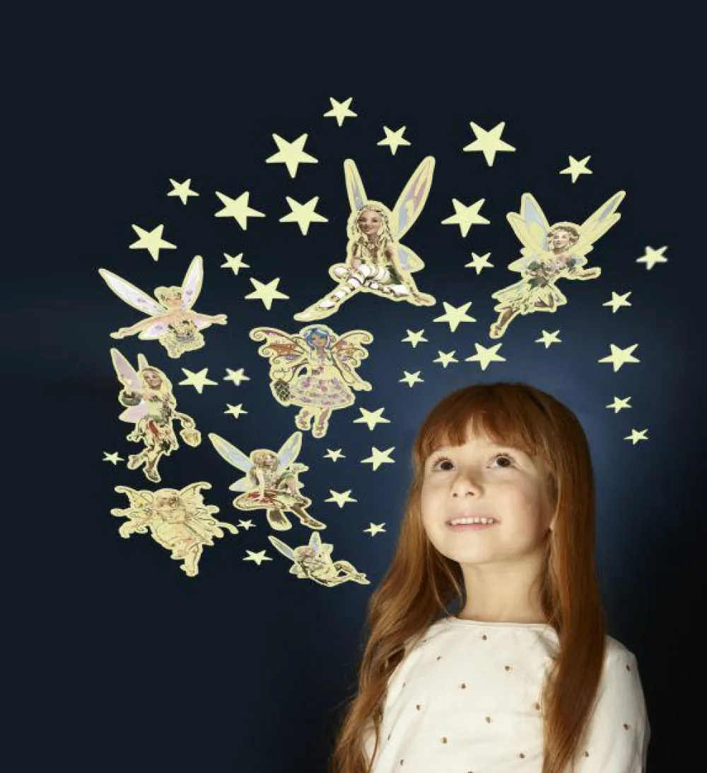Skønt sæt med 8 flotte selvlysende feer og 35 stjerner, som lyser flot op på værelset, når de har været udsat for lyset fra fx en lampe eller lommelygte.