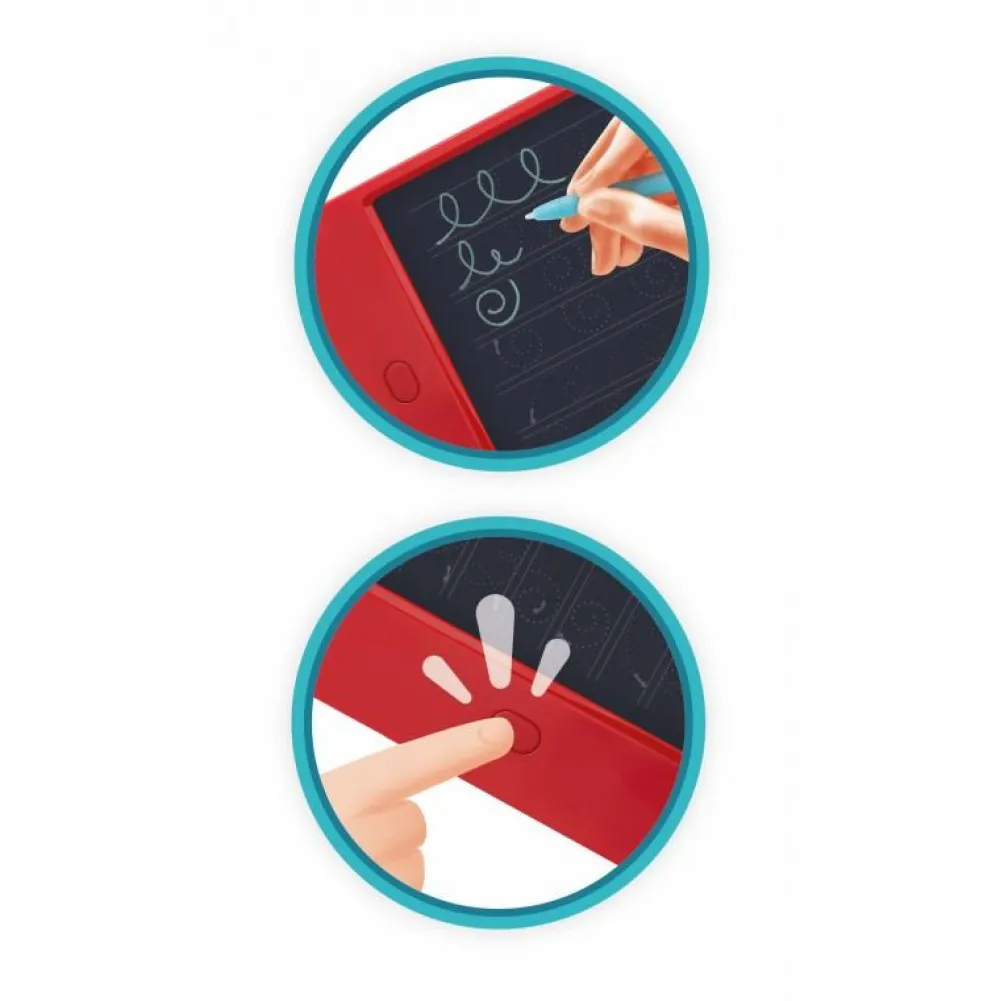 Dit barn øve sig i at skrive bogstaver og tal med pennen, og så er det bare et klik for at slette og starte forfra med et af de 40 øveark, der medfølger.