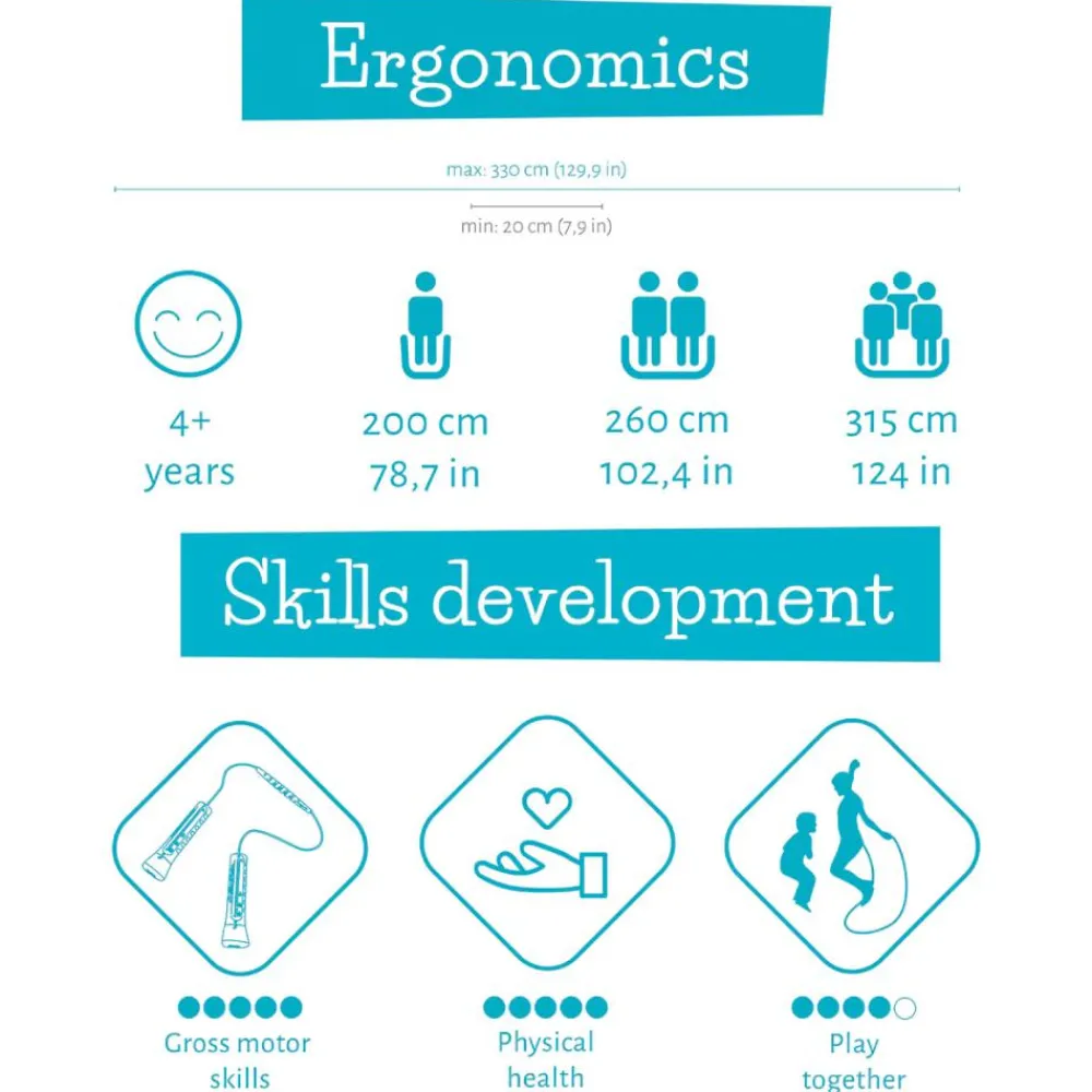 Kan justeres fra 30 cm til 3 meter. Det passer i højden til børn fra cirka 110 cm og op. Det er langt nok til at voksne kan bruge det og til at det kan bruges som buesjippetov.