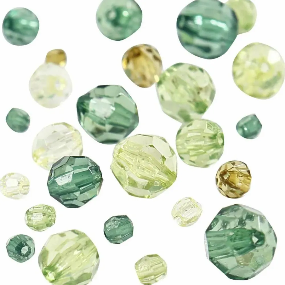 Perlerne er i grønne nuancer, fremstilket i klar akryl og facetslebne. Blandingen indeholder 5 forskellige størrelser.