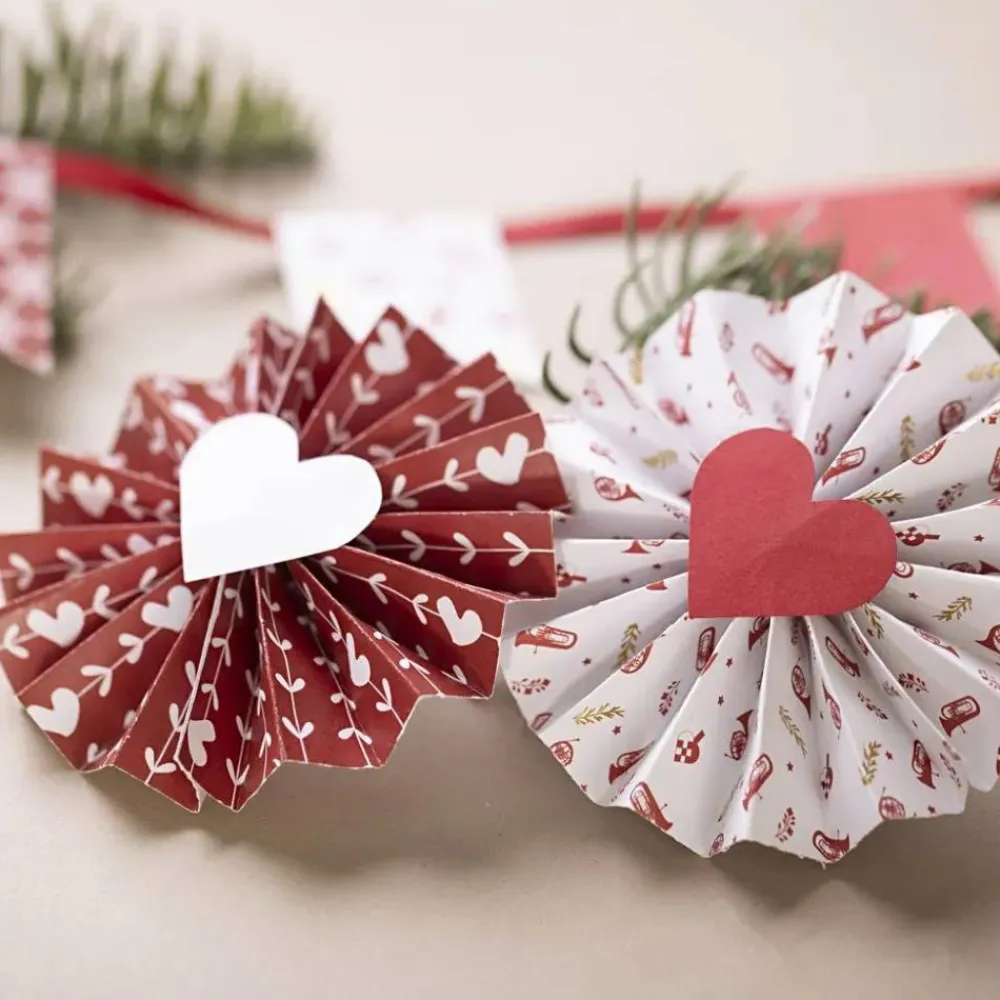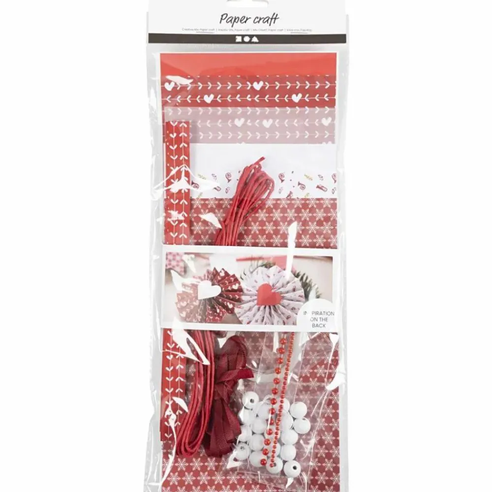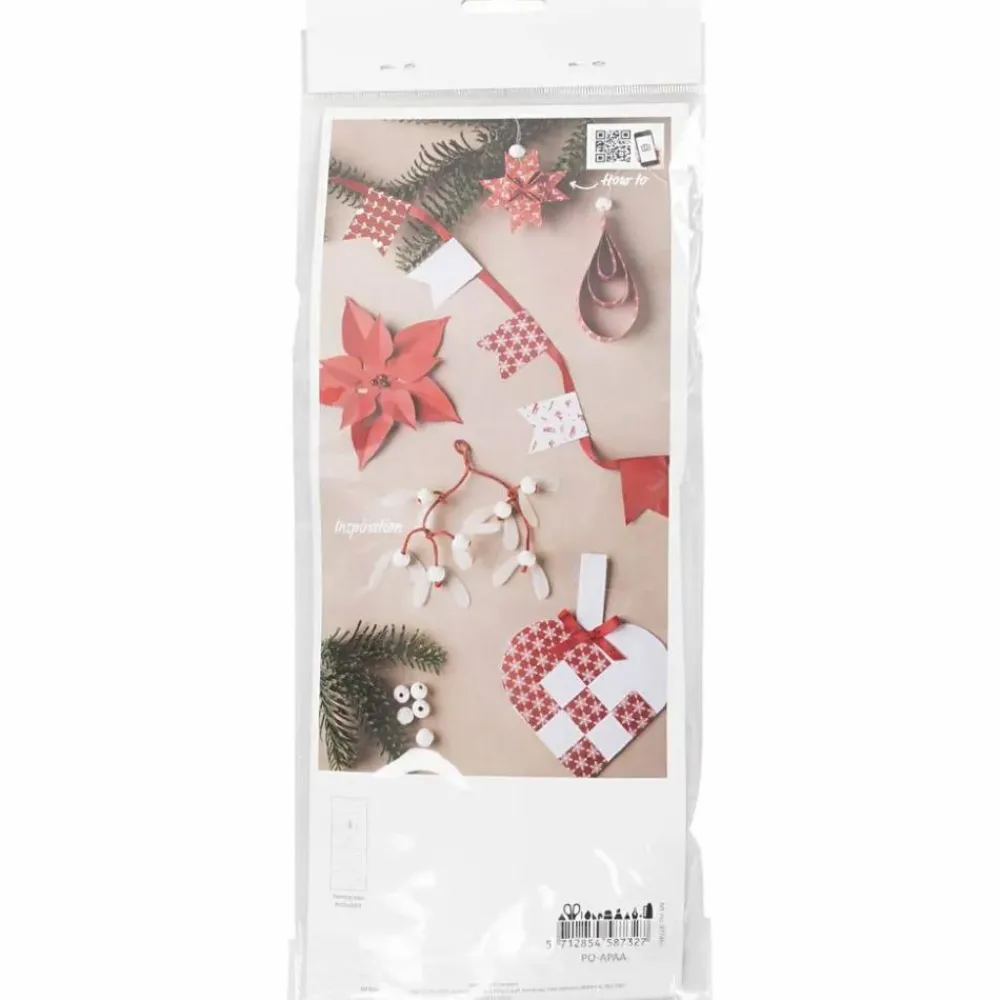 Du får mønstret papir og ensfarvet papir til bl.a. julehjerter, papirstrimler til julestjernerne, halvperler, almindelige perler, tråd, bånd, raffia-wire, tape og skabeloner. (Psst: Raffia-wire er sådan noget papirgarn/naturbast).