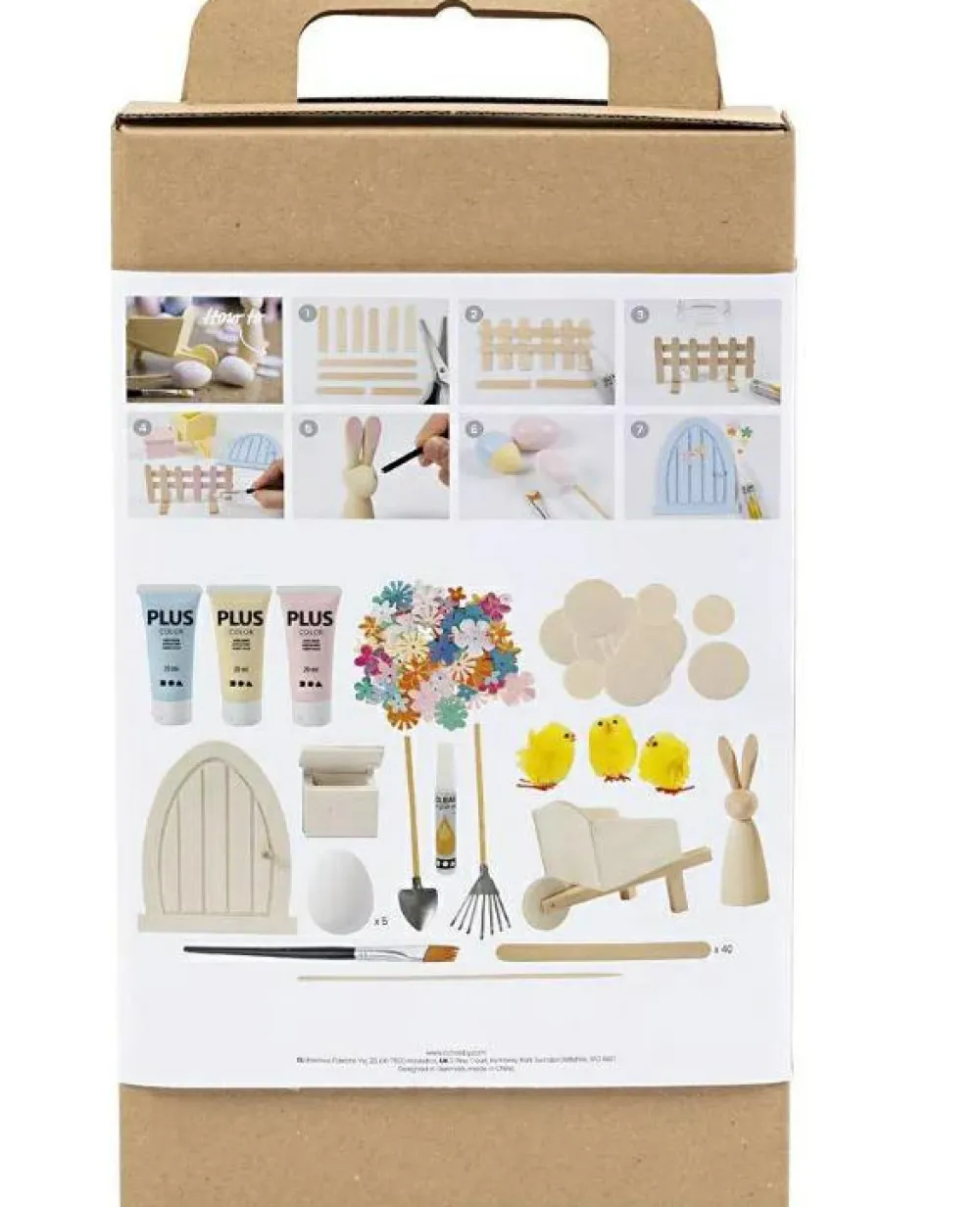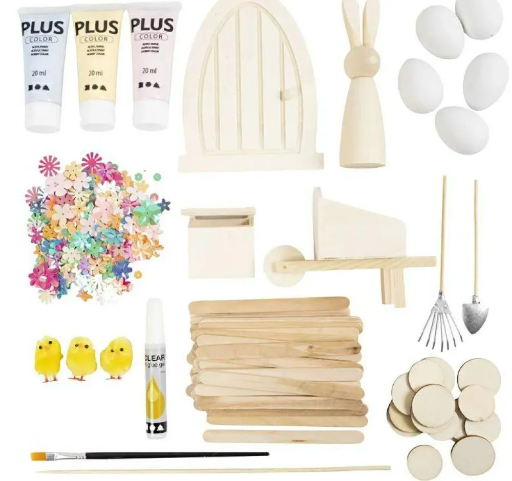 Dør, hare, kyllinger, postkasse, rive, spade og trillebør, femæg af plast, træskiver, ispinde og blomsterpind samt blomsterpalietter, Plus Color vandbaseret hobbymaling, pensel og lim. En vejledning følger også med.