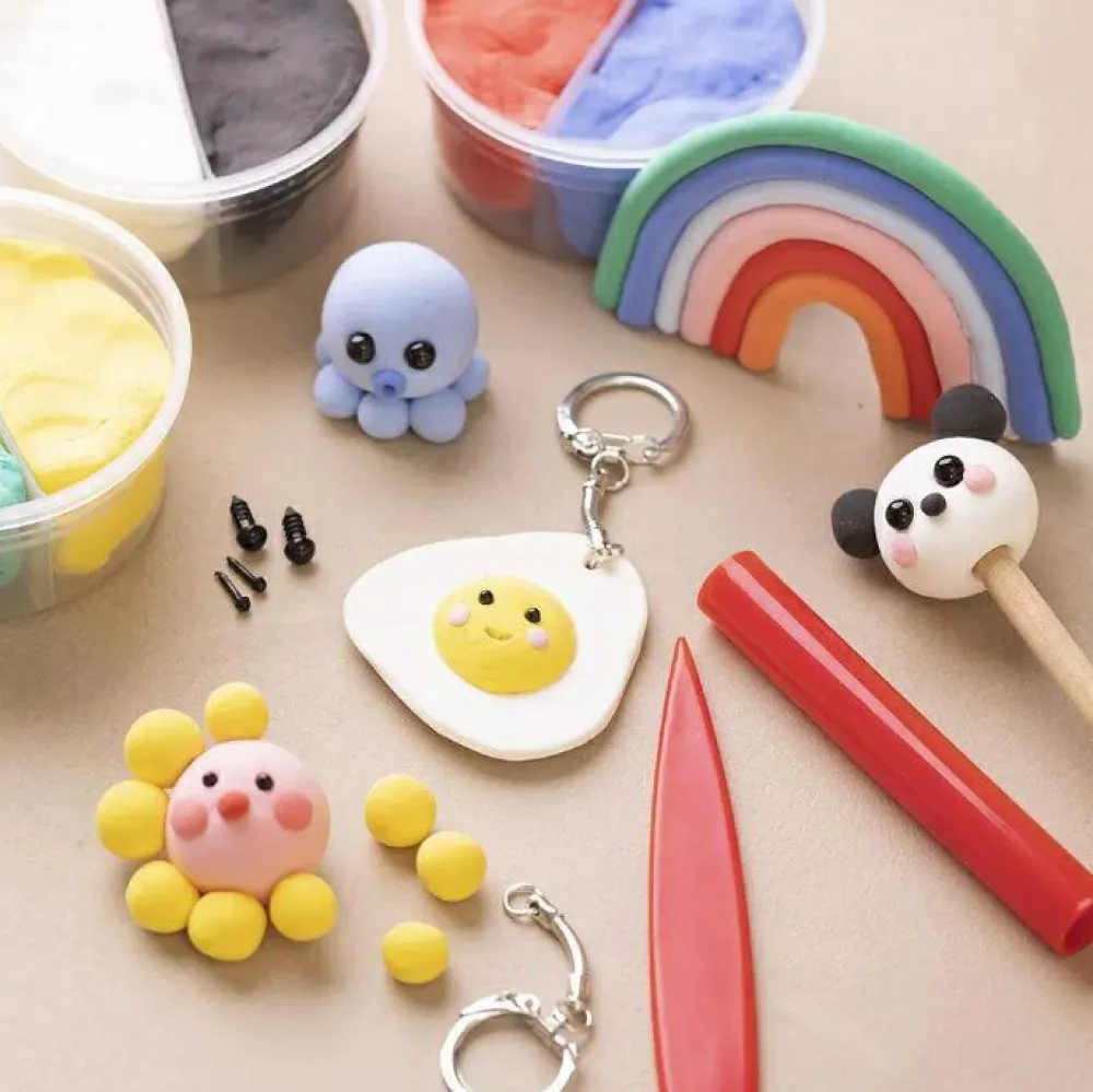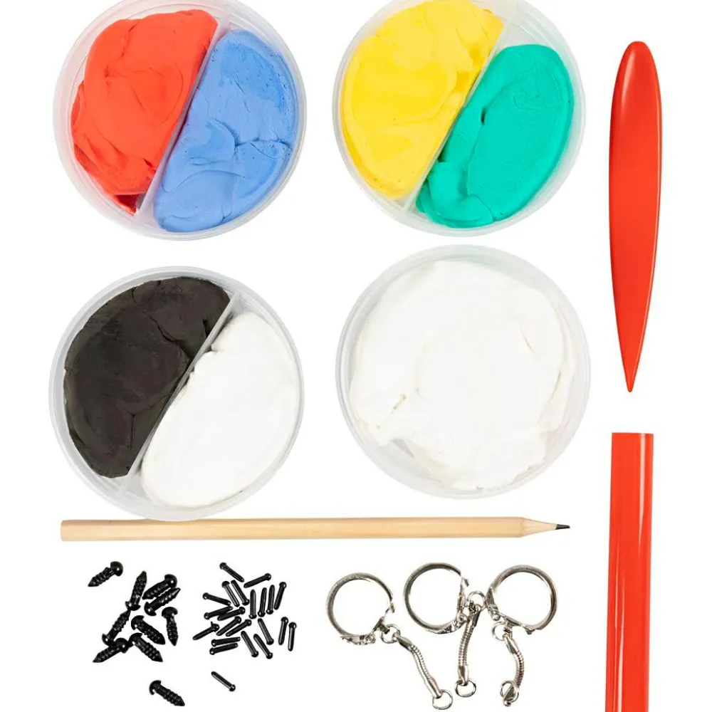 Indhold: Silk Clay® modelleringsmasse, 3 nøgleringe, øjne, modelleringspind, blyant.
