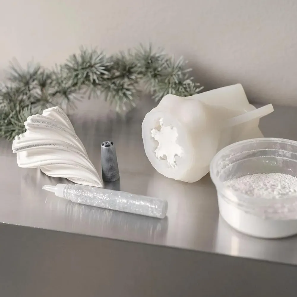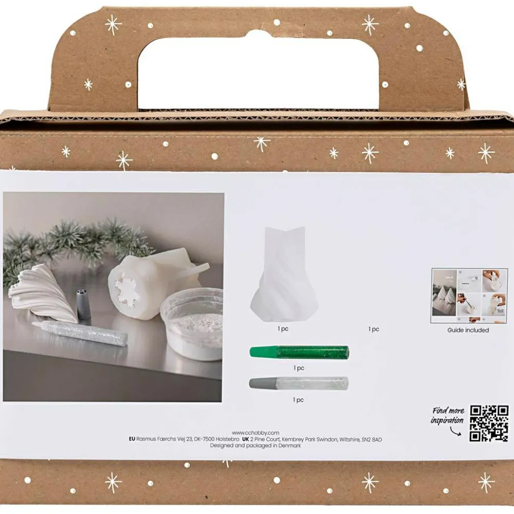 Her er et sæt med alt du eller dit store barn skal bruge til at støbe to hvide juletræer, som bagefter kan få glimmer på og stå og pynte eller måske blive givet i gave.