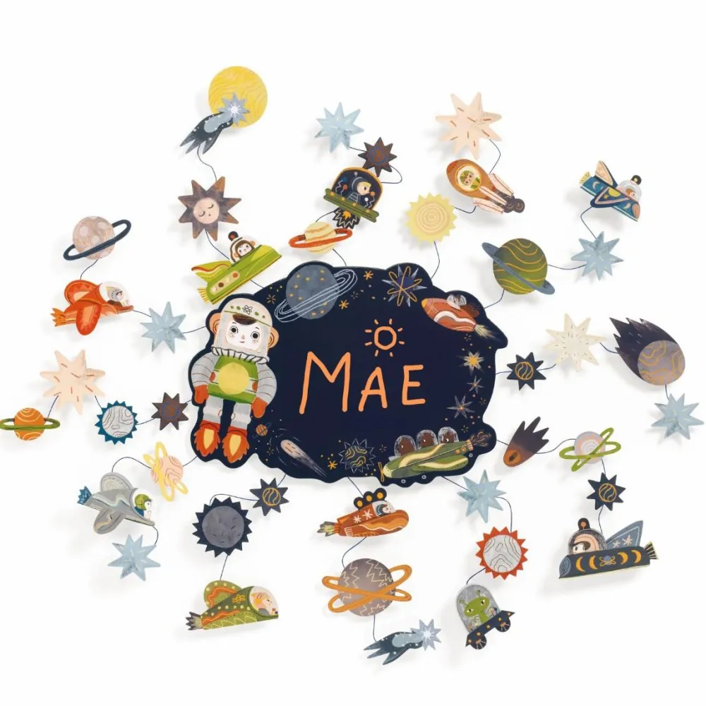Her kan dit barn lave sit eget navneskilt med rumtema.
