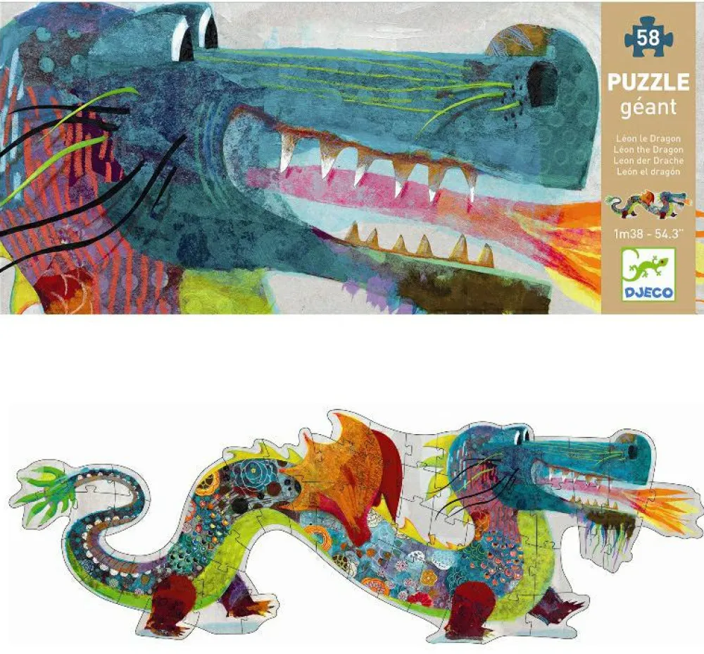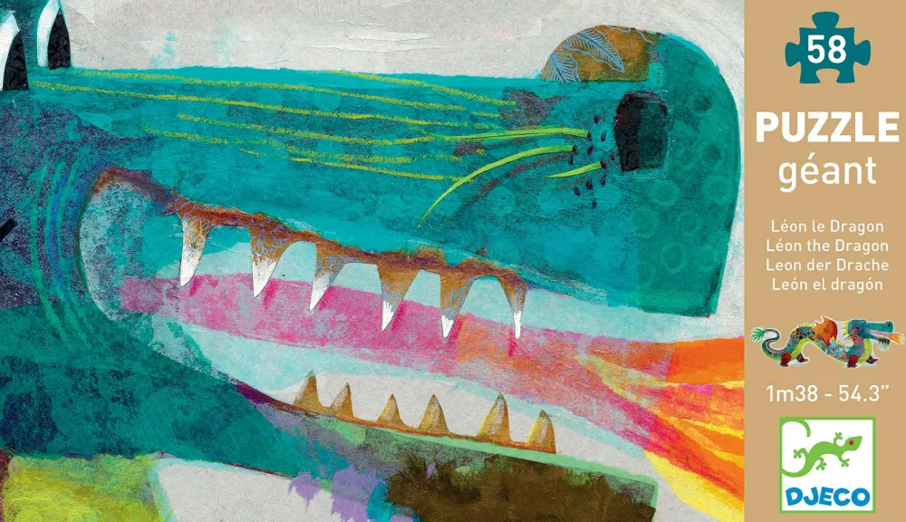 Her har I dragen Leon i et herligt design med 59 kæmpe store brikker, der tilsammen får Leon til at måle 138 cm fra glohed næsetip til farlig halespids.